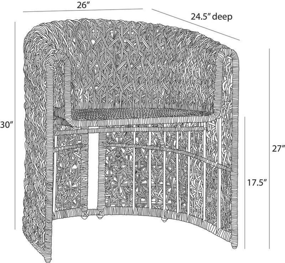 Our barrel-shaped seat delivers a sinuous line from the leg to the raised arms to the floating seat. Woven from synthetic tan rattan in a crisscross pattern, this style features an intriguing split back, allowing it to float within any outdoor living space.