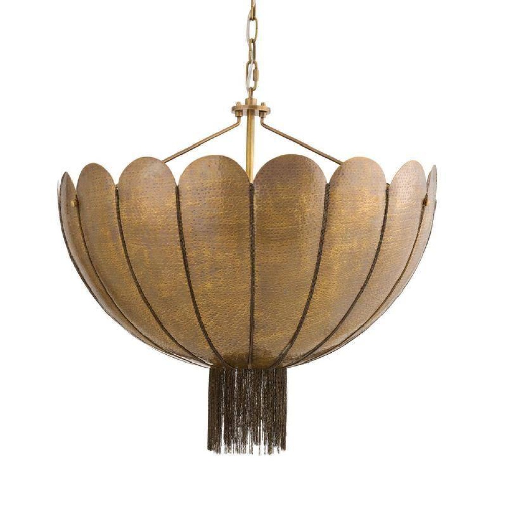 The curved lines and luxurious materials of the Art Deco era inform the scalloped design of the Inaya. The hand-hammered antique brass bowl fixture is designed to deliver an upward wash of light. Delicate antique brass-plated chain details gather along the dome to create a fringed flourish at the base. Damp-rated, although limited covered outdoor conditions may affect finish. Finish will vary.