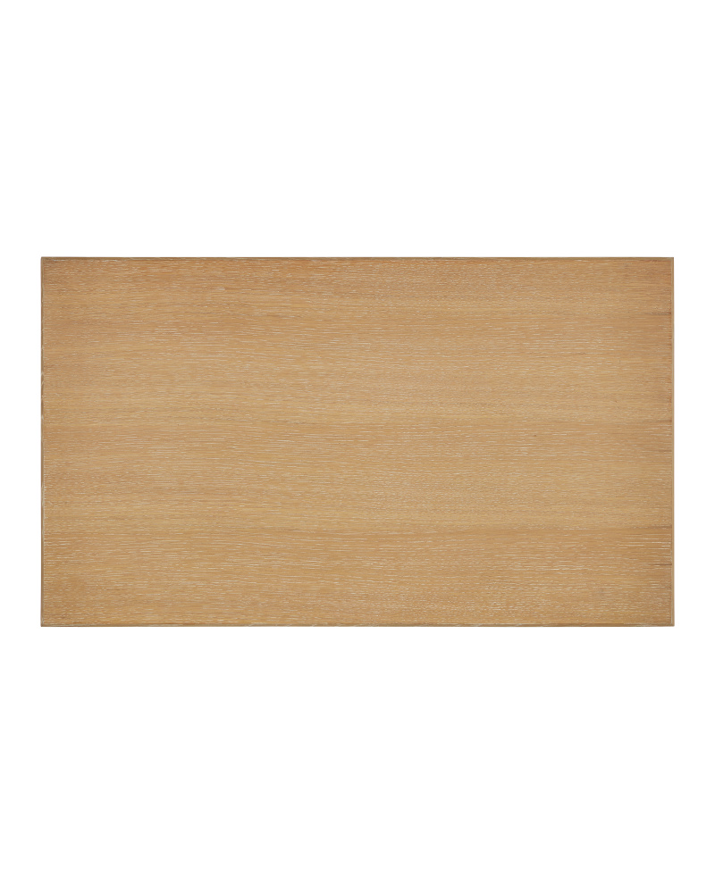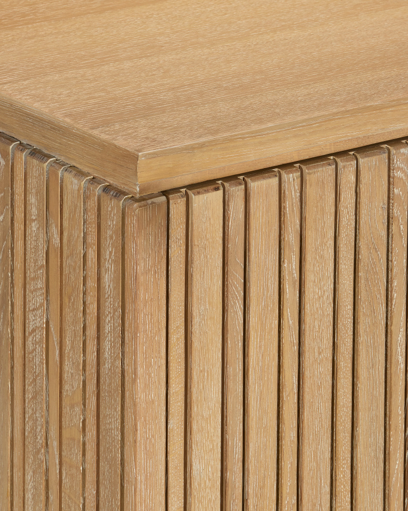The Indeo Washed Oak Cabinet is an intricate piece of furniture. Made of two sizes of solid oak slats that are clad in oak veneers and inset into the frame, the piece is covered in a washed oak finish. The two-door cabinet sits cleverly on iron legs with generously sized stretchers connecting them in a black finish. The cabinet has cord management openings in it for electronics.