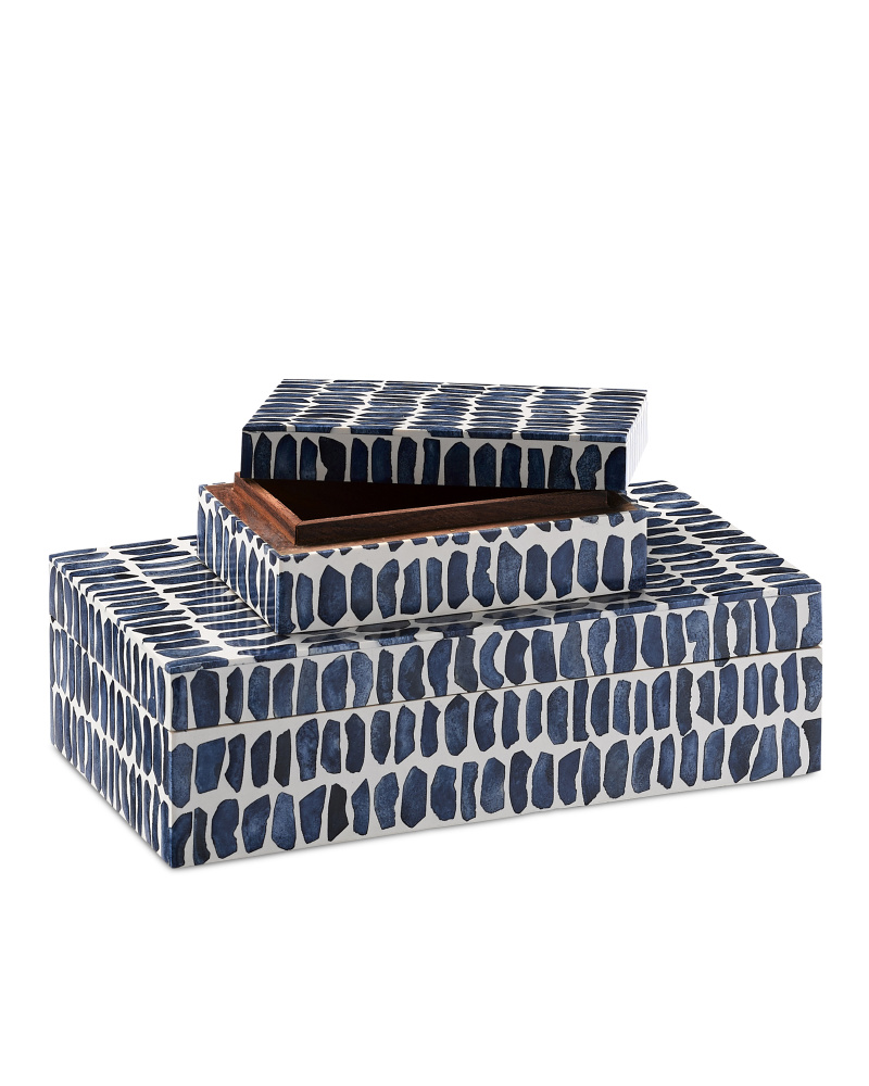 Our Indigo Box Set of 2 includes two blue and white boxes that are textural and playful. The pair of white and navy blue decorative accessories are covered in indigo blue bone and composite.