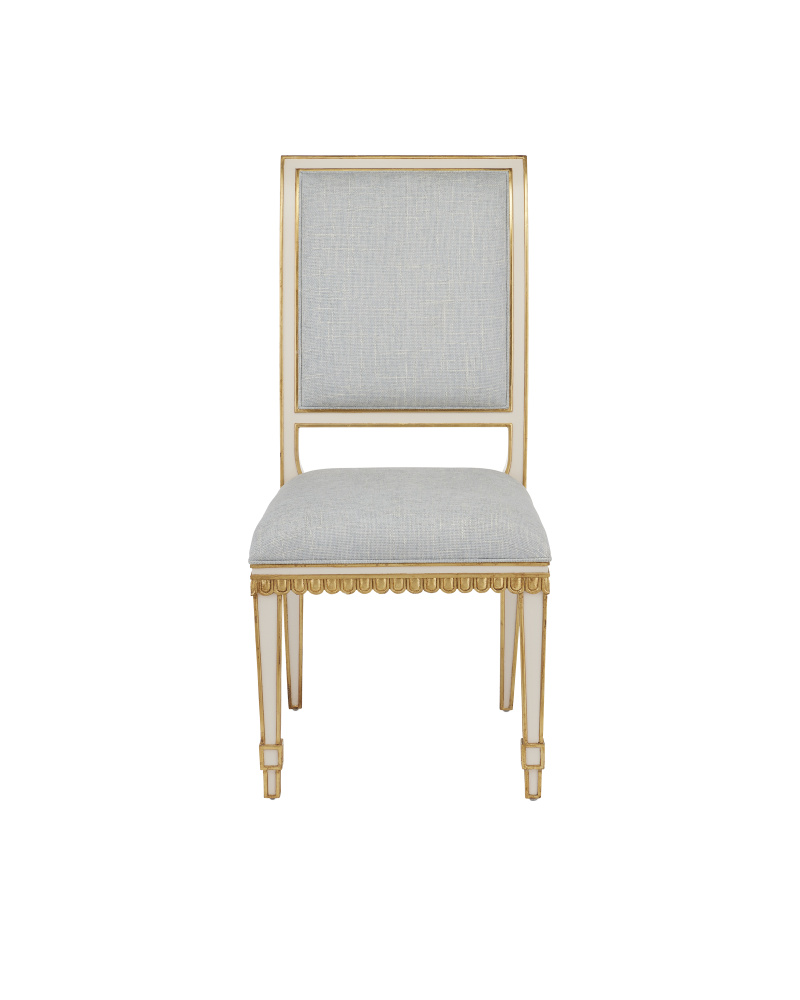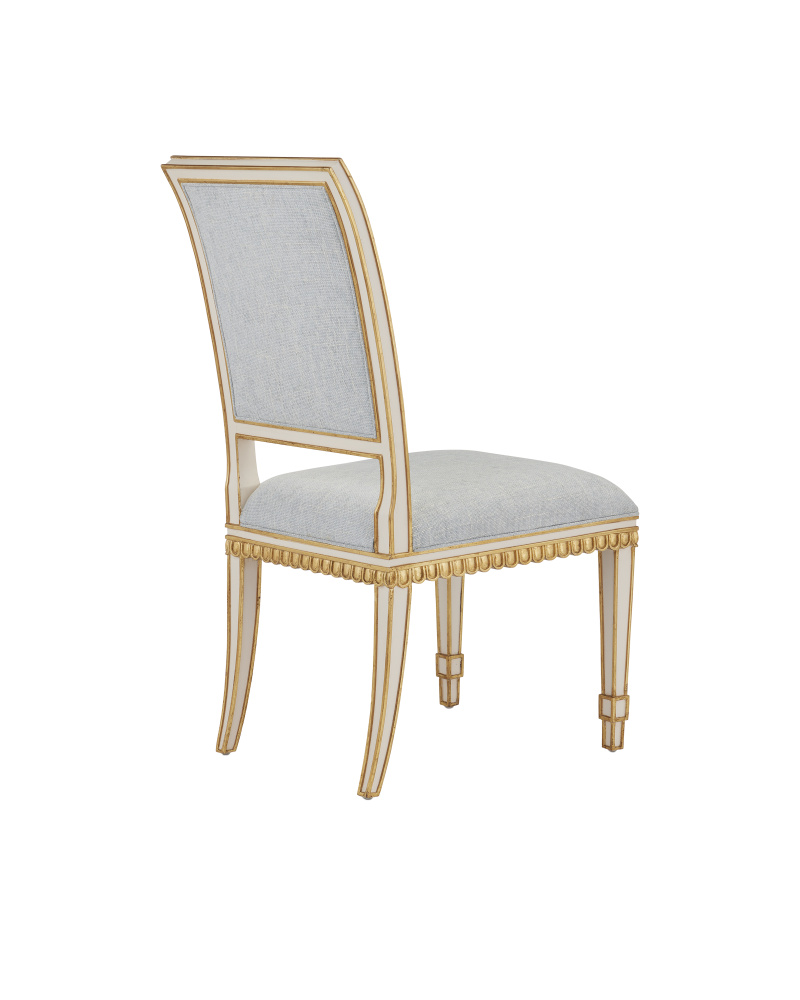 Inspired by a vintage Swedish Gustavian design, the Ines Ivory Chair with a Mixology Moonstone fabric seat exhibits the traditional light gray and pale white tones you’d expect from this famed stylistic era. The mahogany frame in an ivory finish is ornamented with antique gold accents that infuse the chair's design with added elegance. for anyone who seeks out furnishings that imitate European antiques with great pedigree, this is an excellent alternative.