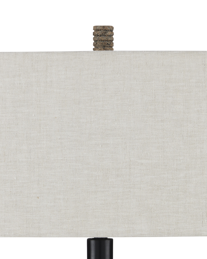 Flat discs of terracotta encircle a wrought iron spine on our Innkeeper Oval Table Lamp. The rustic feel of this natural material means it has subtle variations in color and texture that have been enhanced with a rustic granite finish. The gray table lamp is topped with a vanilla linen shade held in place by a matching terracotta finial. The scale of the elliptical shade is perfectly balanced with the smaller terracotta oval of its body.