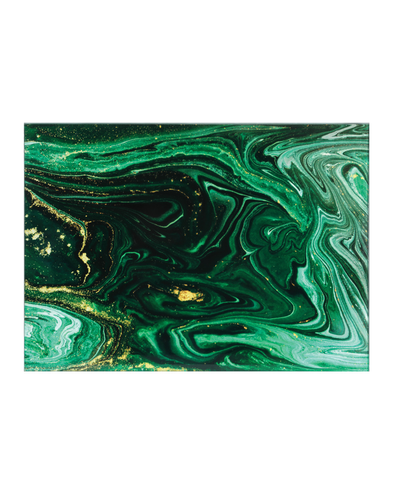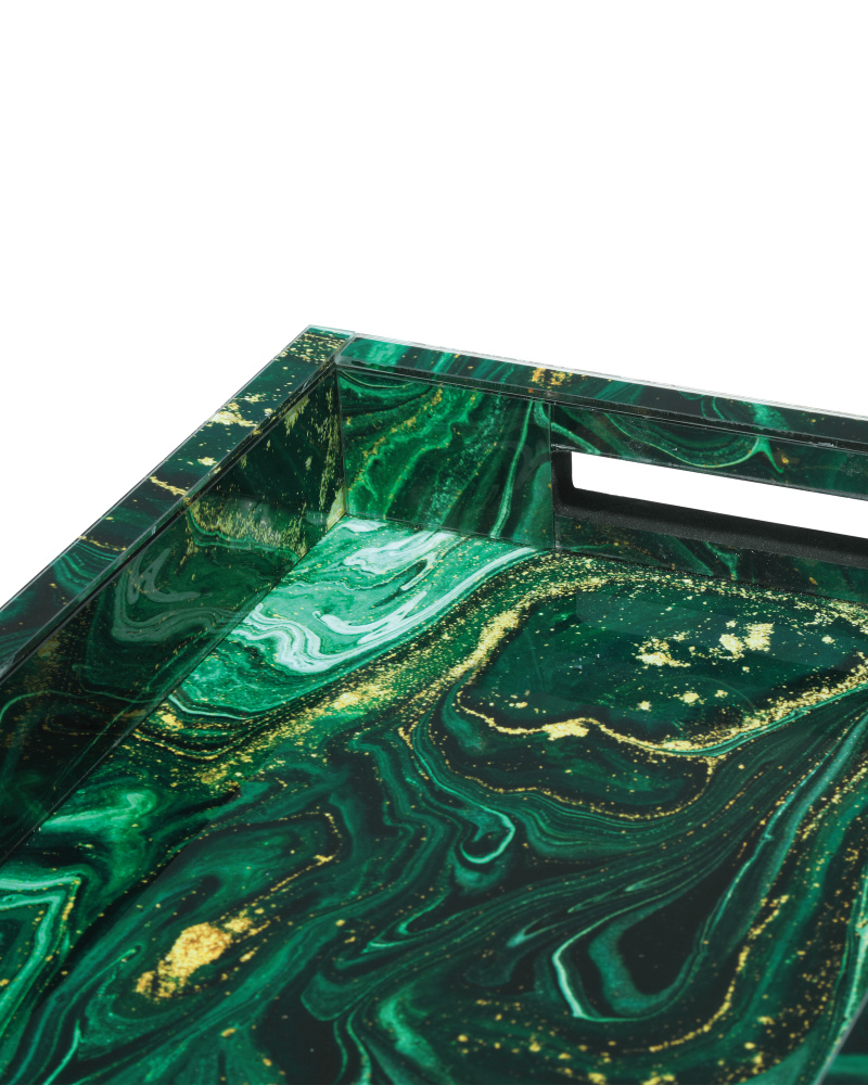 Despite looking like it is made of stone, the Interstellar Green Tray's surfaces are the result of green swirl paper being encased in glass. The coating brings the tray an unparalleled sheen. The interiors of the handles are covered in black felt and the bottom is covered in foam. Because this accessory is handmade, the patterns will vary.