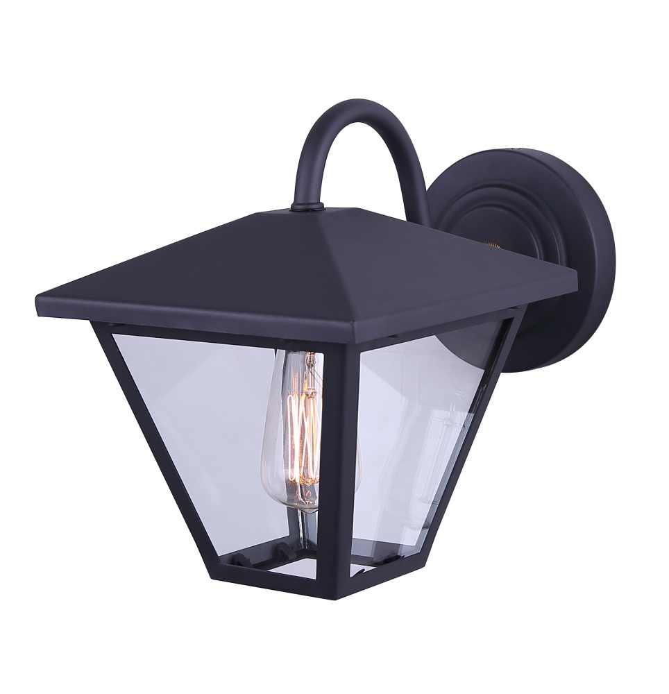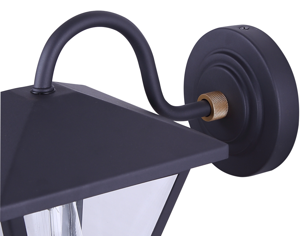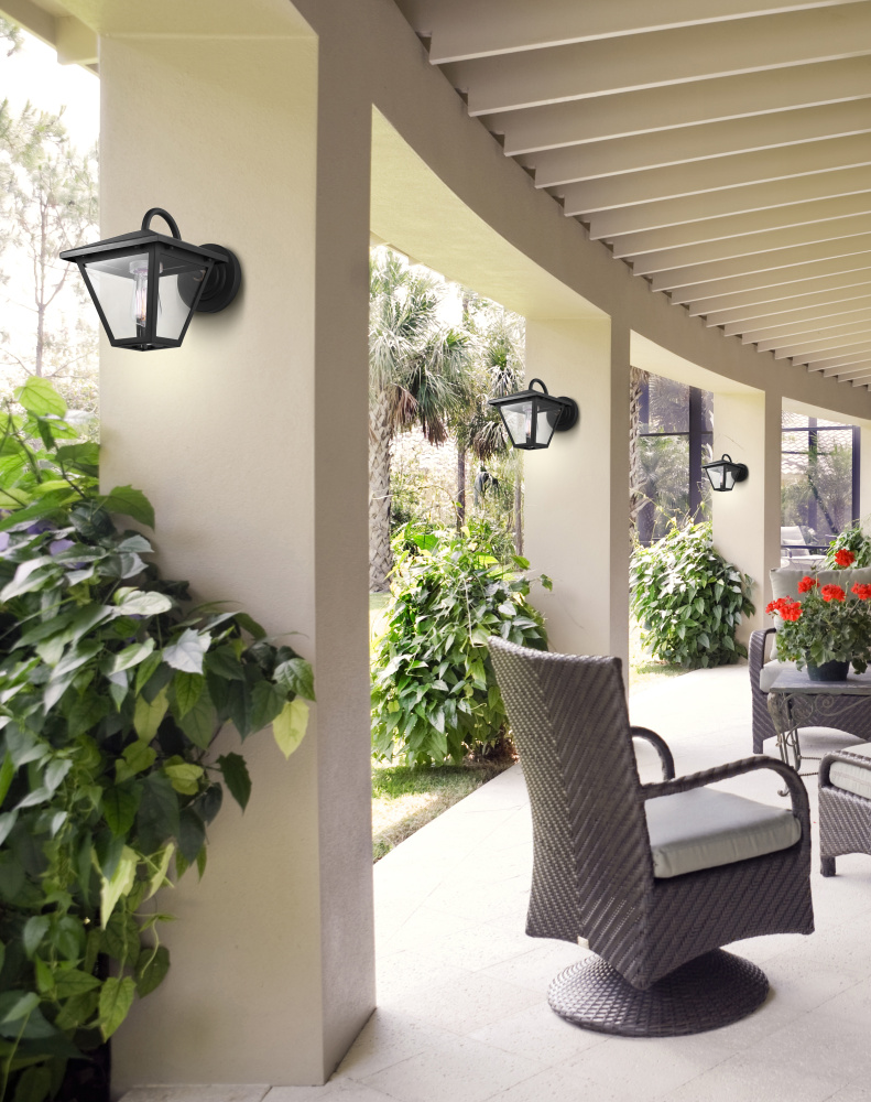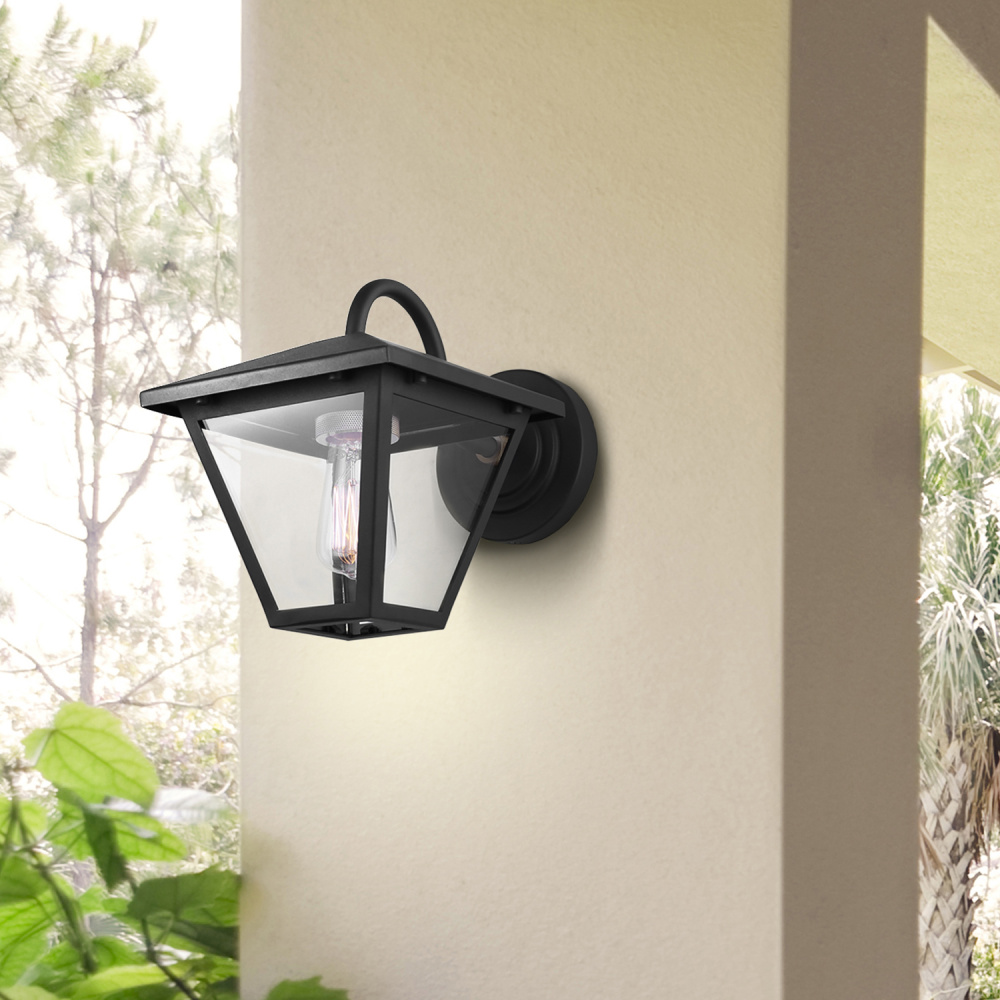 The IRA outdoor wall light blends modern sophistication with a touch of vintage charm. Its matte black frame is accented with subtle gold details, creating a fixture that feels both elevated and timeless. Clear glass panels showcase the bulb inside, offering bright illumination that enhances curb appeal while maintaining a sleek profile. Measuring 7 inches wide by 9 inches high, this wall-mounted light is sized perfectly for entryways, patios, or garages. Wet rated for durability, IRA delivers both style and reliable performance in all weather conditions.