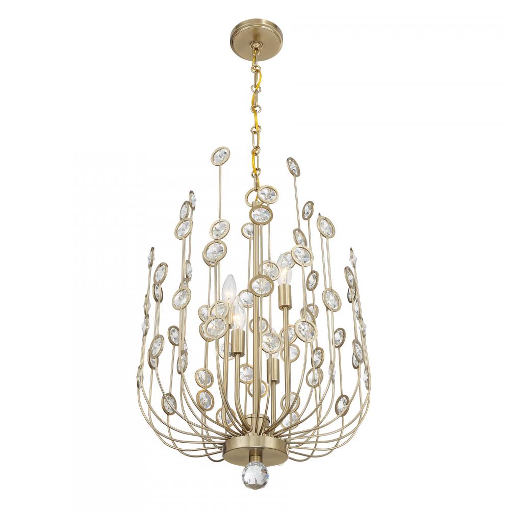 Unique, intriguing and eye-catching, the Savoy House Irina 4-light foyer light is sure to steal the show. Long, lean arms curve up and reach for the sky, finished in shimmering Noble Brass and adorned with octagons of faceted clear crystal held inside circular frames. Irina is 26" in height and 18" in width. Uses four candelabra size bulbs of up to 60 watts per bulb. Bulbs not included. Comes with 120" of chain.