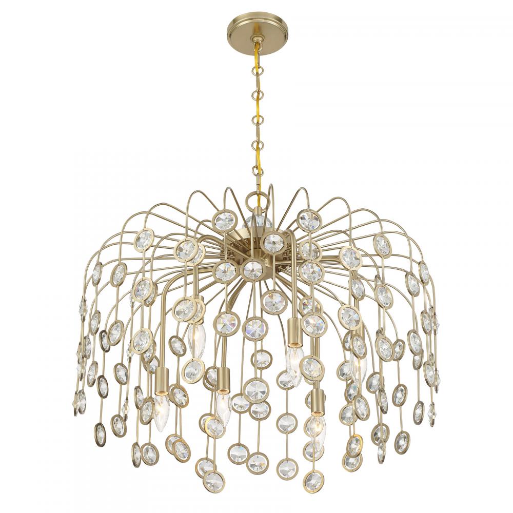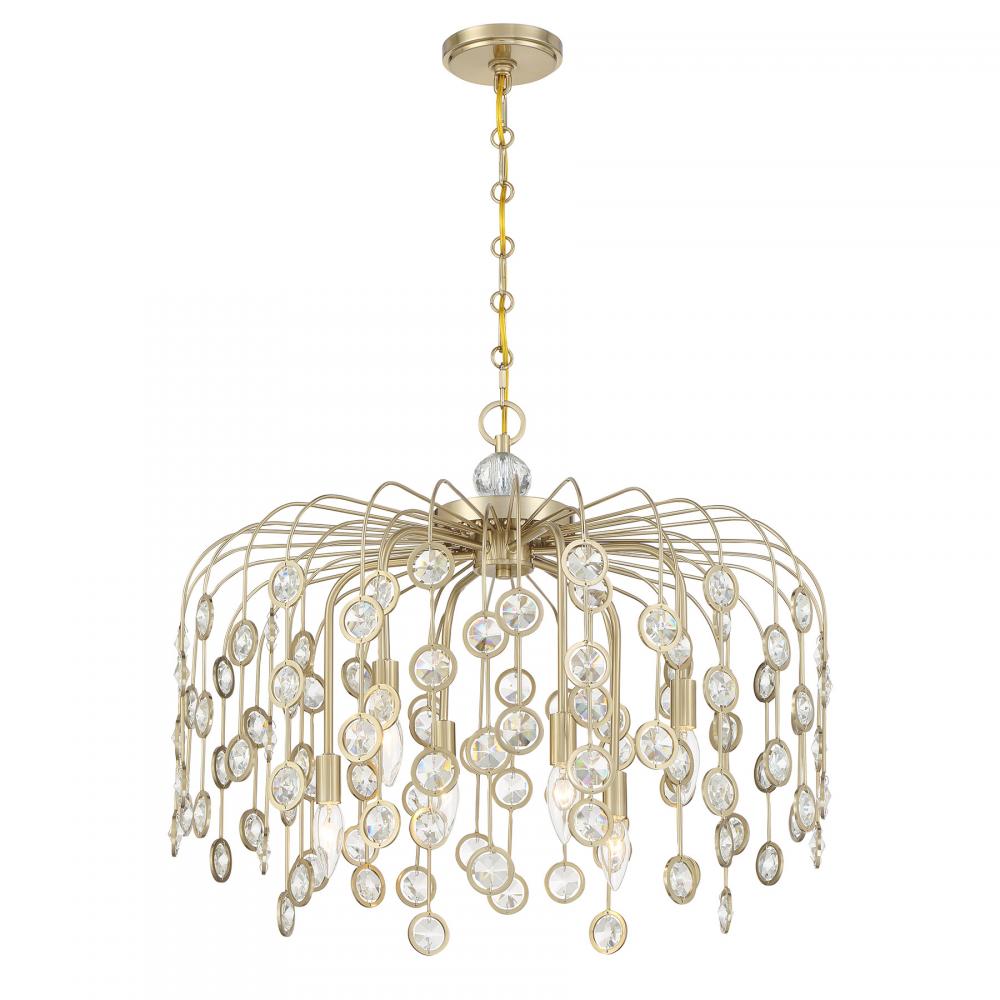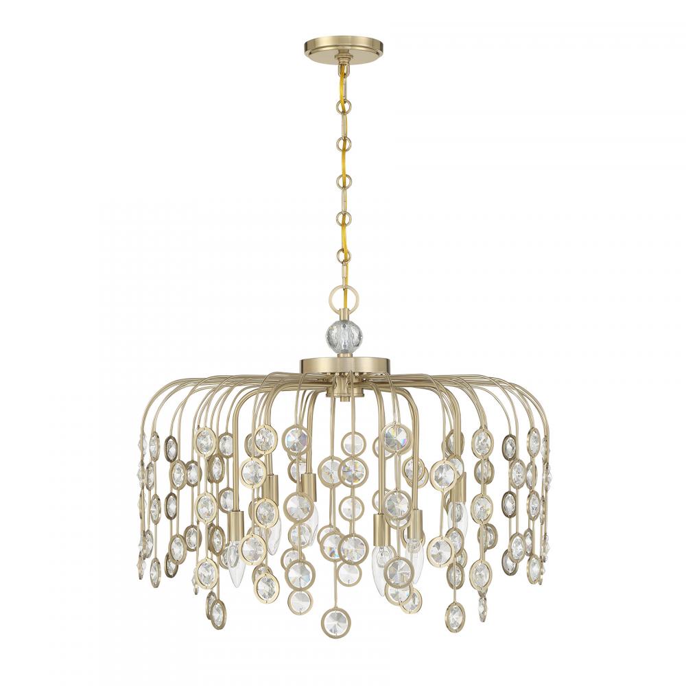 Unique, intriguing and eye-catching, the Savoy House Irina 6-light chandelier is sure to steal the show. Long, lean arms curve down and cascade, finished in shimmering Noble Brass and adorned with octagons of faceted clear crystal held inside circular frames. Irina is 21" in height and 26" in width. Uses six candelabra size bulbs of up to 60 watts per bulb. Bulbs not included. Comes with 120" of chain.
