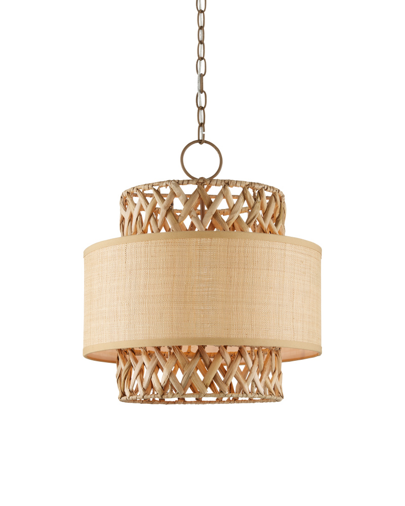 The natural material story continues with the Isola Pendant with its wrought iron frame in a khaki finish and mix of natural water hyacinth and grasscloth fabric. The smaller, taller cylinder that encircles the light has a rough luxe weave of the water hyacinth; while the wider, shorter cylinder has a tighter weave that juxtaposes the looser crosshatching on this tan pendant. Both the interior and exterior of the inner geometric form are finely finished to create a refined and sophisticated product. Adjustable from 25" to 99" with use of included chain/rod kit/cable. If your space calls for a longer drop, additional chain/rods/cable is available for purchase.