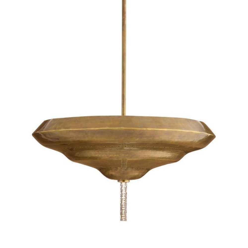 Based on a ceremonial plate, the burnished form of Istanbul is pierced by a textured column of smoke-luster glass to add extra intrigue to its eye-catching design. Hand-formed of antique brass-plated iron, this exotic fixture is finished with pierced details to allow illumination to shine through. Damp-rated, although limited covered outdoor conditions may affect finish. Finish will vary.