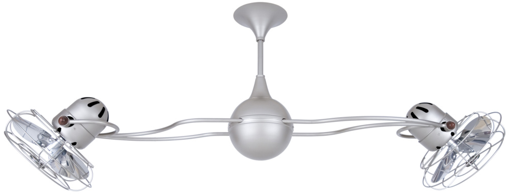 The Italo Ventania is the largest rotational fan in the Matthews Fan Co collection. Its vortex sculpted arms grasp also remarkable, side-mounted fan heads in gentle, equatorial rotation. The fan heads can be infinitely positioned in 180-degree arcs for optimum air movement; the greater the angle of the motor to the horizontal support rods (up or down), the faster the axial rotation. A slow, controlled axial rotation is achieved by both fan head position and fan blade speed.