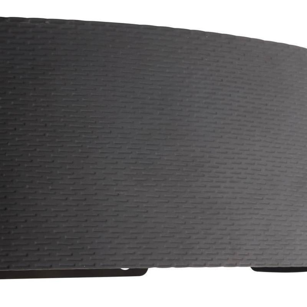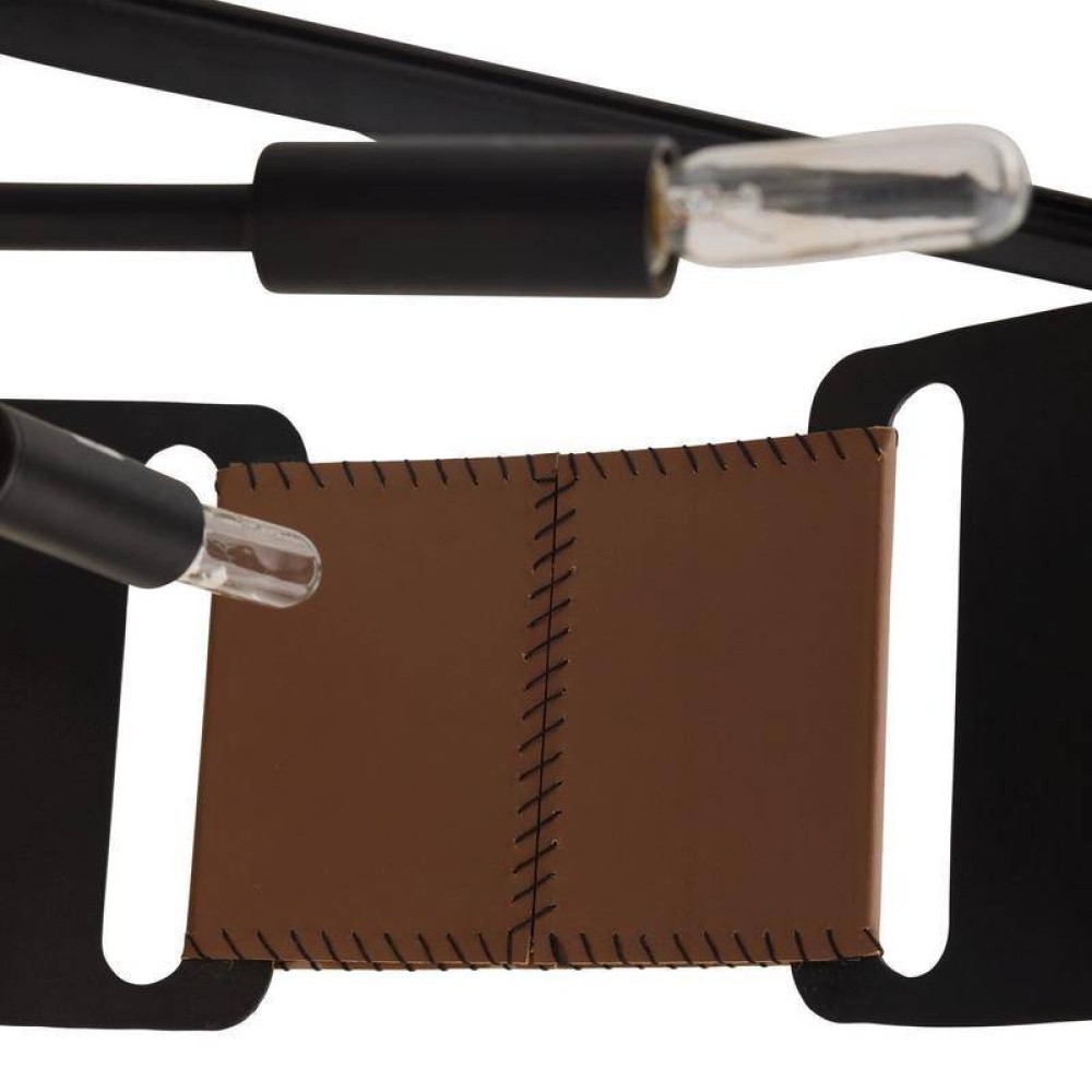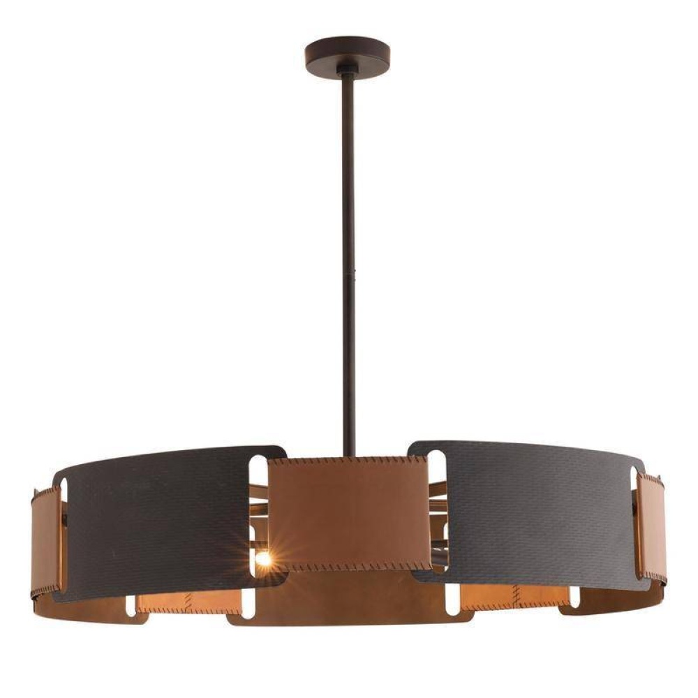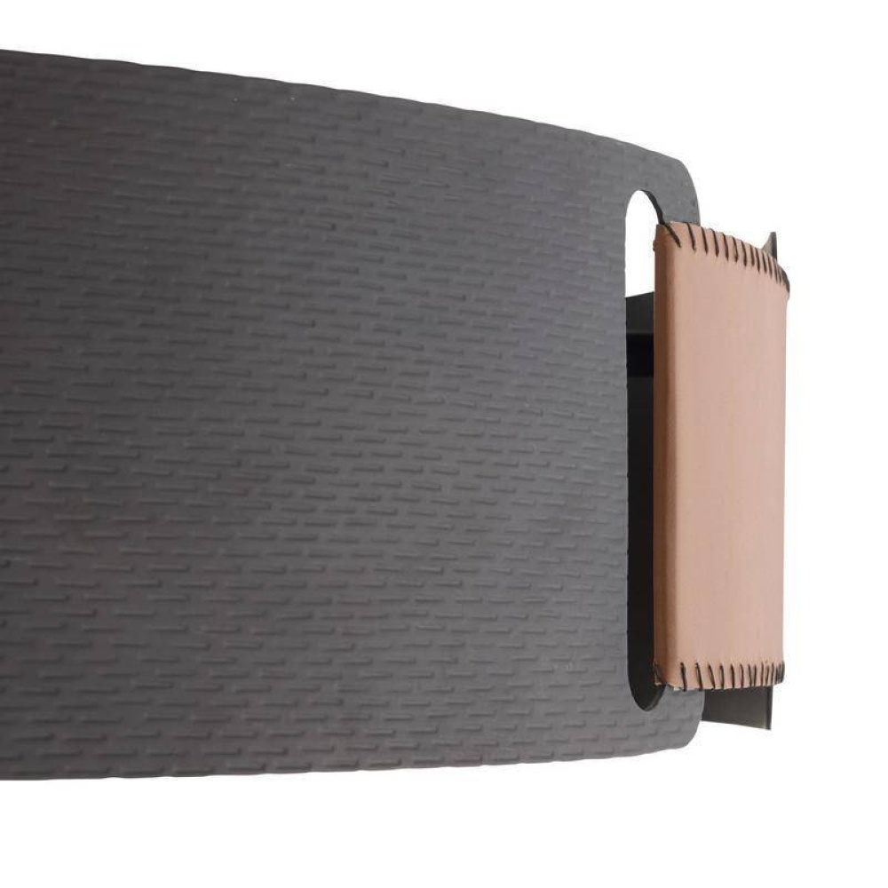 Whipstitched brown leather straps draw together a blackened hammered iron ring in a mix of texture and material. Reinventing equestrian language for the modern living space, this design plays with negative space via cutouts that allow the light to shine through. Blackened iron pipe and frame. Damp-rated, although limited covered outdoor conditions may affect finish. Finish will vary.