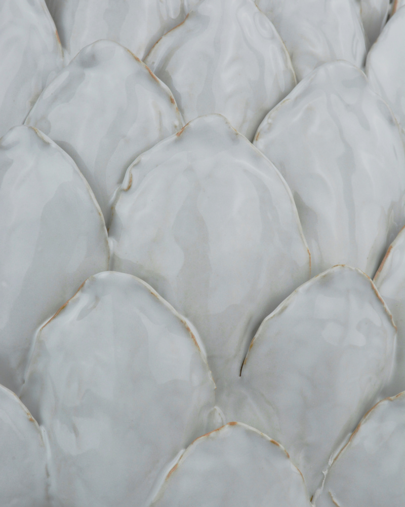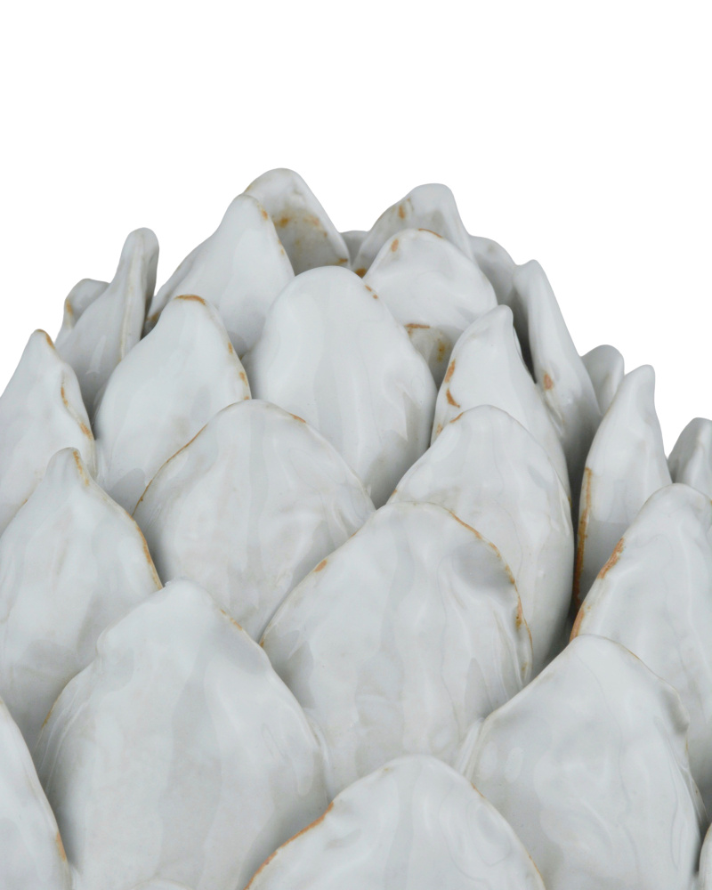 Made by a group of women who live at the border of Burma and Thailand, the Ivory Artichoke is an incredible hand-thrown ceramic sculpture with each leaf appliedby hand one by one. This nature-inspired piece has tremendous character and a richness to it, which is due to the white glazing that is applied after the piece is composed. A hint of texture is achieved when the natural terracotta color of the material shows through on the top edges of the leaves.