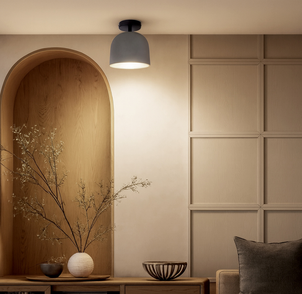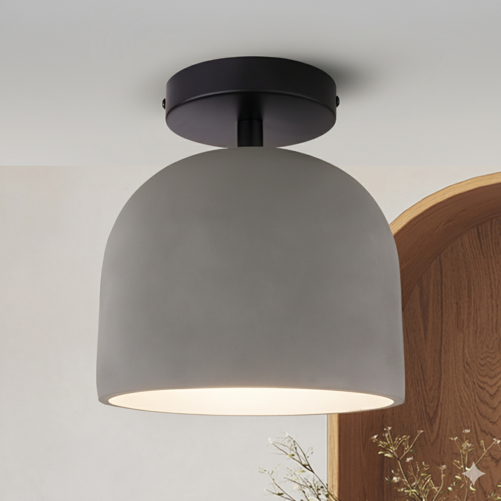 The JACK semi-flush ceiling light combines modern design with a minimalist touch, featuring a matte black frame and a distinctive grey cement shade. The cement finish mirrors the natural texture of stone, emitting a warm, grounded glow that enhances any room’s appearance. At just under 8.75 inches wide, this compact ceiling light is ideal for small to medium spaces such as entryways, kitchens, or bedrooms. Designed for a single 60W Type A bulb, it offers practical brightness with subtle style. With its blend of industrial-inspired material and contemporary form, JACK is a ceiling light that feels understated, versatile, and effortlessly cool.