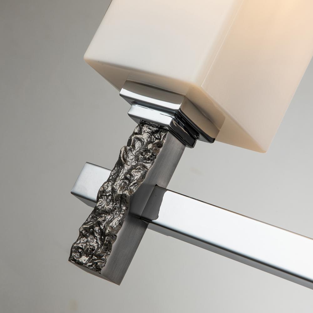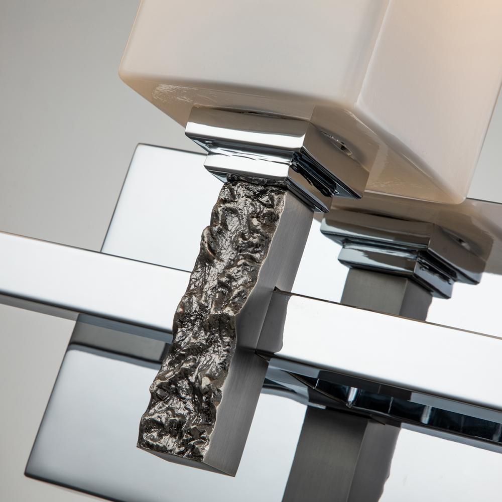 Jack 3 Light Bath Bar in Polished Chrome has rectangle shaped Opal glass shades. The smooth finish with the textured detailing creates a unique lighting masterpiece.