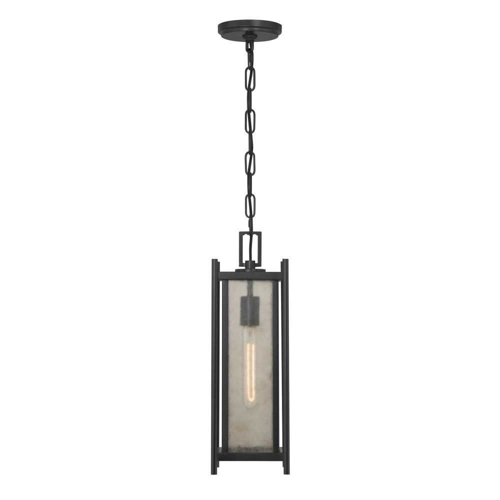 Elevate your porch or patio with the modern poise of the Savoy House Jacobs 1-light outdoor hanging lantern. Its clear mica glass shade creates a subtle, glowing shimmer, complemented by bold metalwork finished in Black. Jacobs is 18.25" tall and 5.75" wide. Uses one standard size bulb of up to 60 watts. Bulb not included. Damp area rated for covered outdoor spaces.