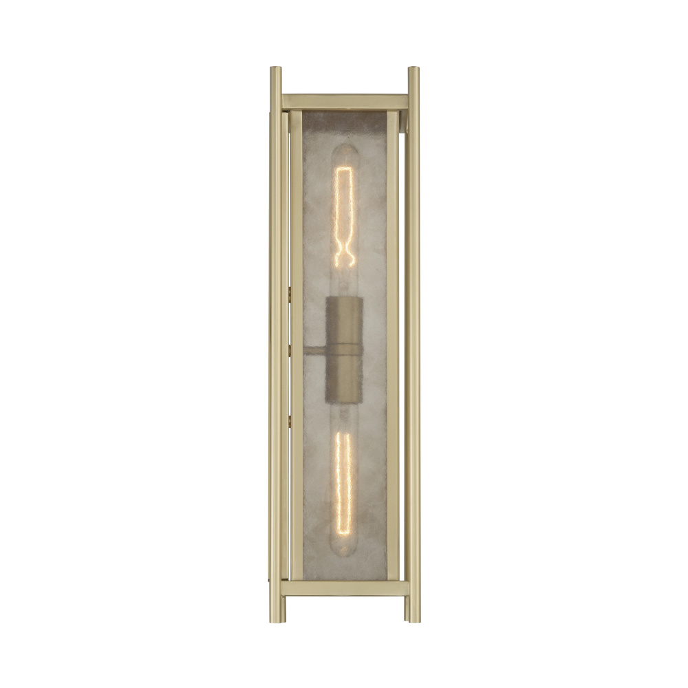 Brighten outdoor entries with the layered light of the Savoy House Jacobs 2-light outdoor wall lantern. Clear mica glass softens the illumination and is beautifully balanced by the Serene Brass finish. Jacobs is 22" tall, 5.75" wide and extends 6" from the wall. Uses two standard size bulbs of up to 60 watts per bulb. Bulbs not included. Wet area rated.