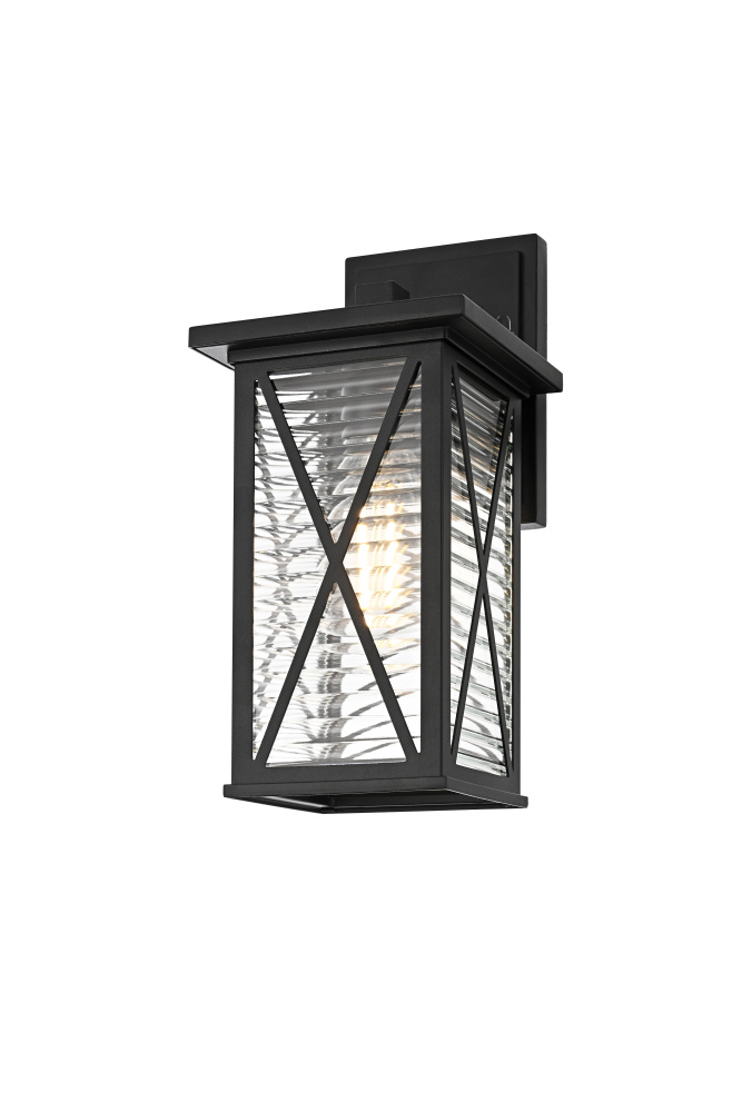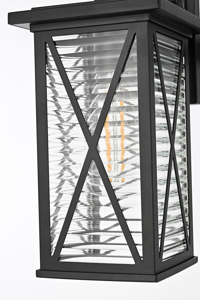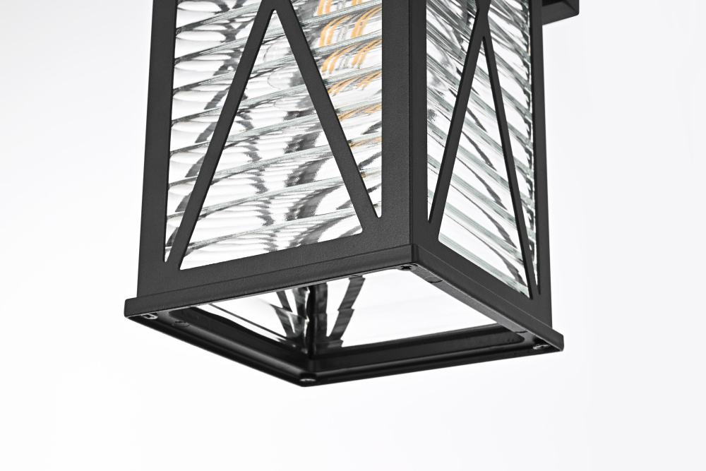 This outdoor wall light blends classic lantern styling with modern craftsmanship, featuring a rectangular metal frame, fluted glass panels, and crisscross detailing. The clear fluted glass creates a rippled effect, diffusing the light for a balanced glow while maintaining brightness. Crafted from iron and aluminum, the sturdy black-finished frame ensures long-term durability in outdoor conditions. Pre-wired with a 7-inch lead, this wall light is a strong and stylish choice for enhancing outdoor spaces. The open-bottom design allows for quick and hassle-free bulb changes, while the fixture supports a single medium-base E26 bulb (40W max, not included). Dimmable and ETL Wet Rated, this pendant light brings a structured and refined presence to exterior spaces. Built with marine-grade, corrosion-resistant aluminum, this sconce withstands coastal conditions for long-lasting durability.