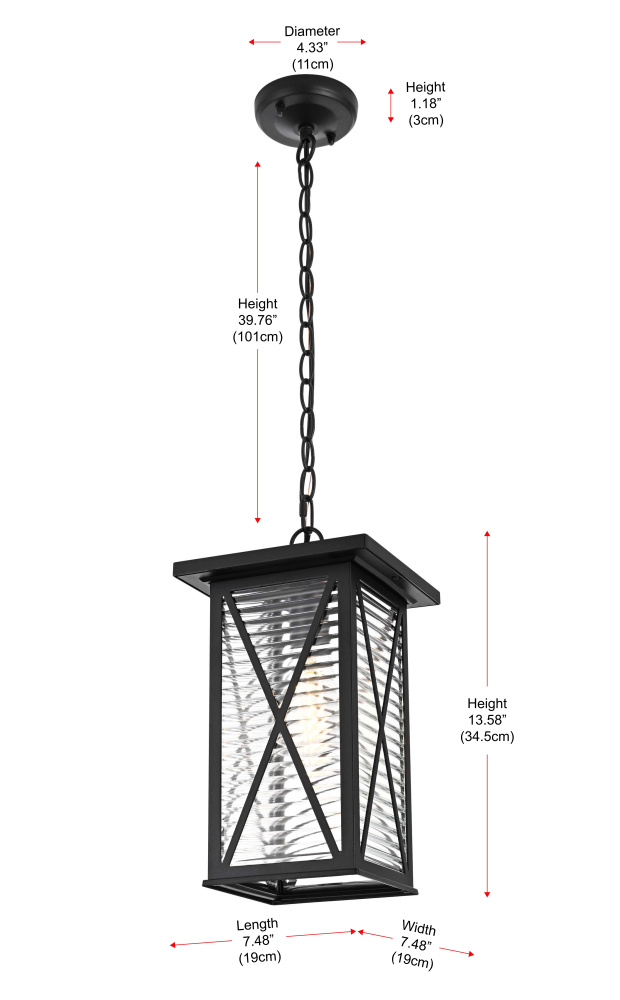 This outdoor pendant light blends classic lantern styling with modern craftsmanship, featuring a rectangular metal frame, fluted glass panels, and crisscross detailing. The clear fluted glass creates a rippled effect, diffusing the light for a balanced glow while maintaining brightness. Crafted from iron and aluminum, the sturdy black-finished frame ensures long-term durability in outdoor conditions. The adjustable 39-inch chain offers a hanging height between 18 and 56 inches, making it adaptable for porches, patios, and covered entryways. The open-bottom design allows for quick and hassle-free bulb changes, while the fixture supports a single medium-base E26 bulb (40W max, not included). Dimmable and ETL damp Rated, this pendant light brings a structured and refined presence to exterior spaces. Built with marine-grade, corrosion-resistant aluminum, this sconce withstands coastal conditions for long-lasting durability.