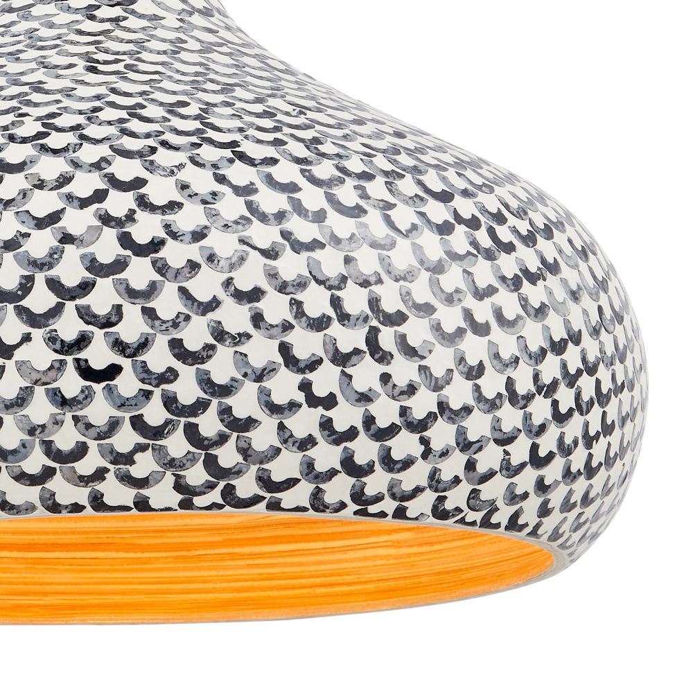 The Savoy House Jade 1-light pendant lets you illuminate your home with natural beauty. Its gourd-shaped shade is crafted from spun bamboo and is adorned with an intricate black fish scale pattern on a white background, creating energetic intrigue. Whether used solo or in groupings, Jade is sure to stand in the spotlight! It is 13" in height and 18" in width. Uses one standard size bulb of up to 60 watts. Bulb not included. This fixture is supplied with 120" of hanging cord.