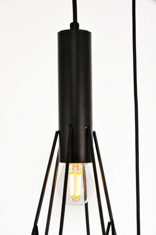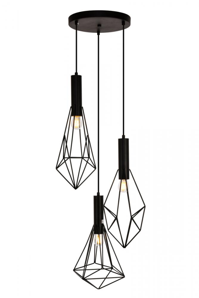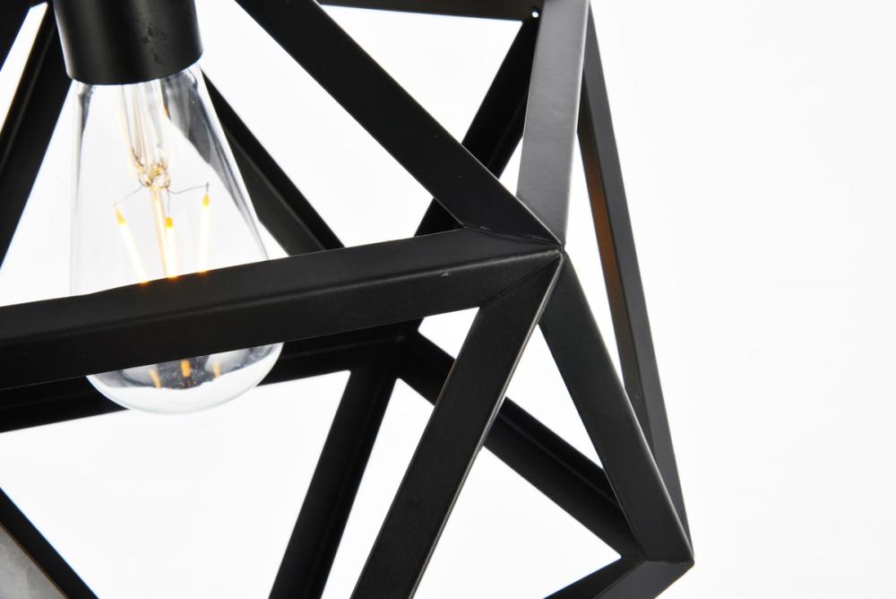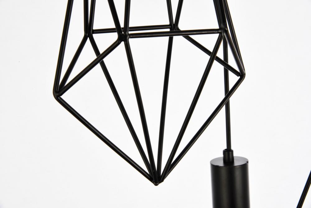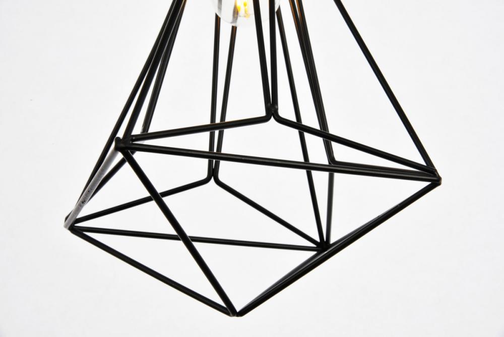 Sublime symmetry that’s perfectly on trend! Jago collection hanging fixtures are a modern breath of fresh air in a bedroom, living room, kitchen, dorm, or studio. Slender rods form three complex, faceted gem-shaped shades, in a black finish, hanging from slim cords and a circular mounting fixture. Exposed incandescent or LED bulbs (not included) shine at the center of the open frame to complete this stylishly minimal look.