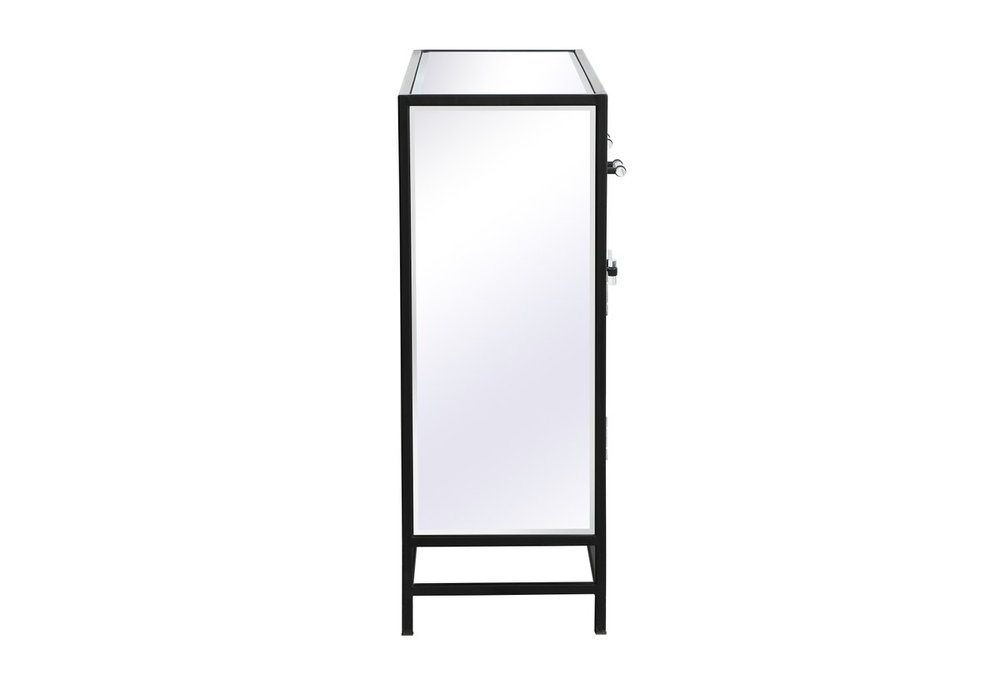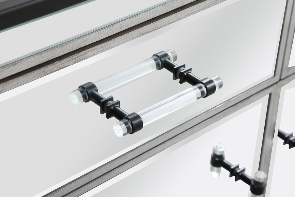 Crafted with mdf, clear mirror panels, and acrylic handles with metal accents
