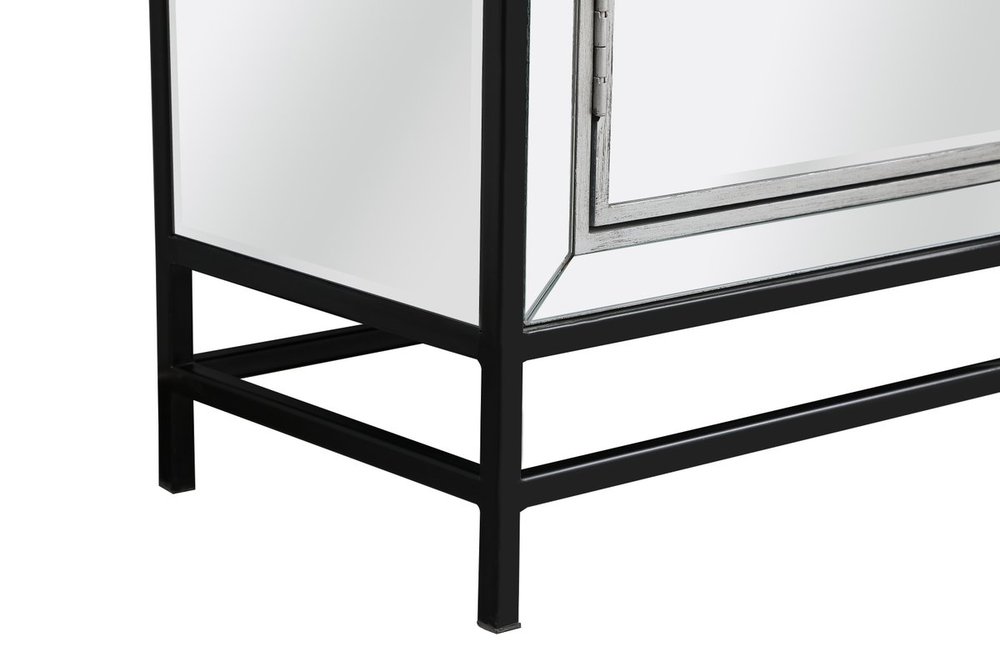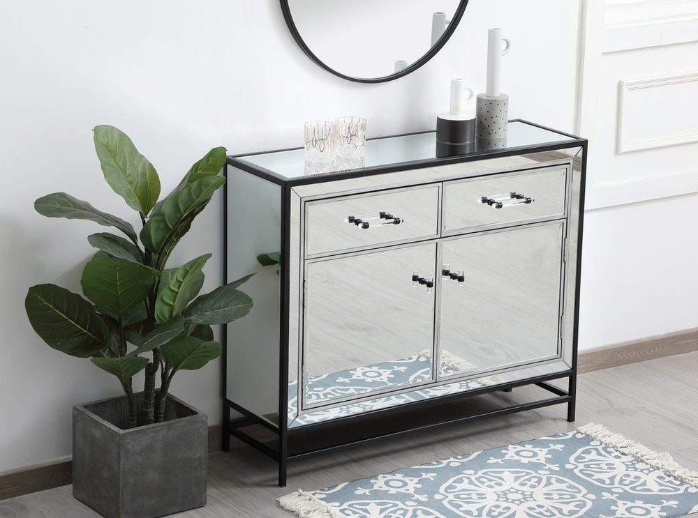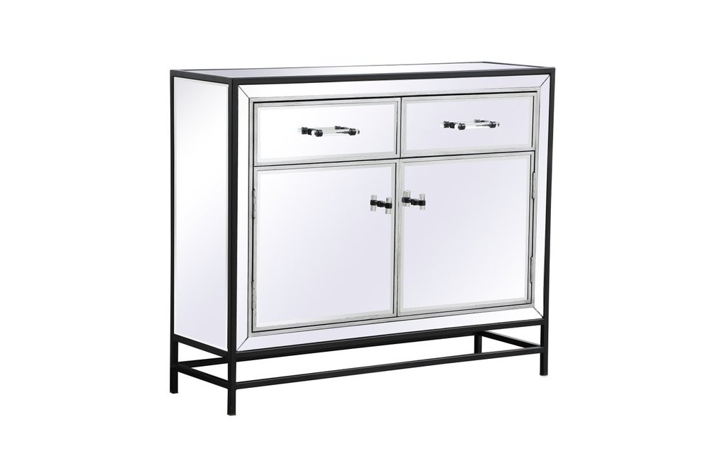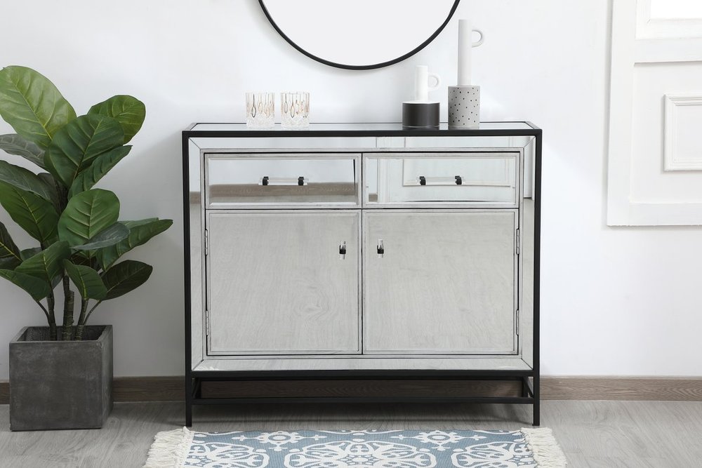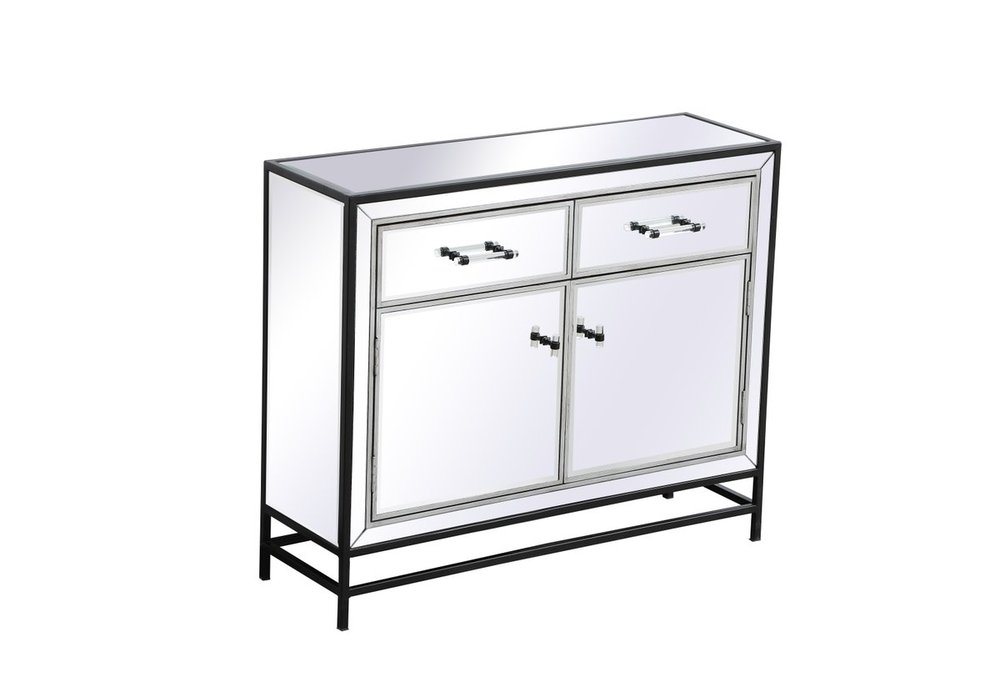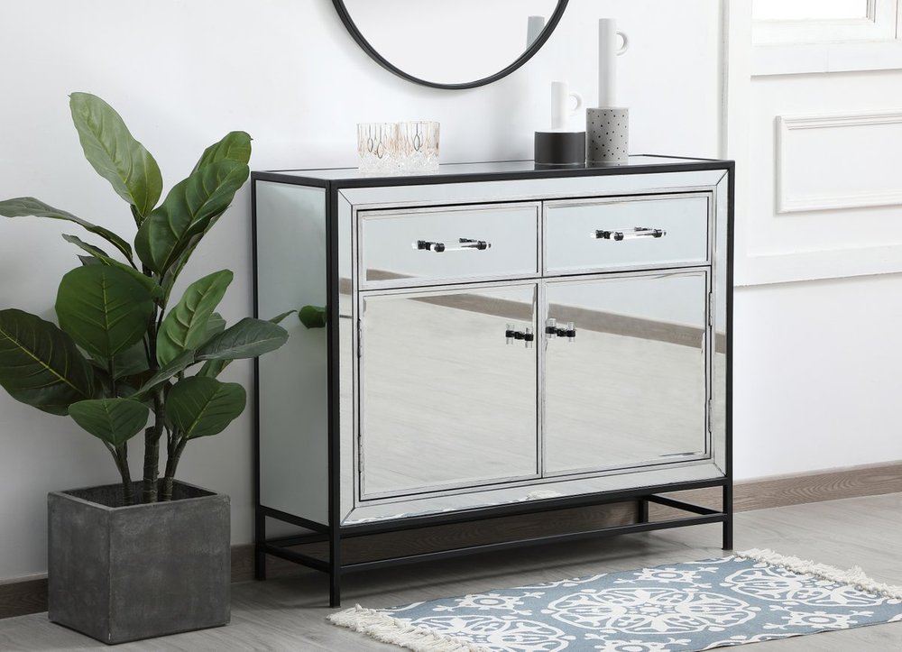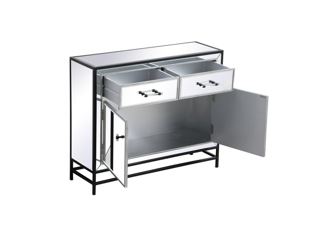 Bring plenty of storage space and modern style to your living room with this mirrored cabinet. This was made to withstand everyday use. Deep drawers to hold up to 66 pounds and opens quietly. This versatile cabinet blends in easily with any décor and easy to maintain. Ships fully assembled and ready to use. With anti-tip straps included for added security, this modern addition will complete your room.