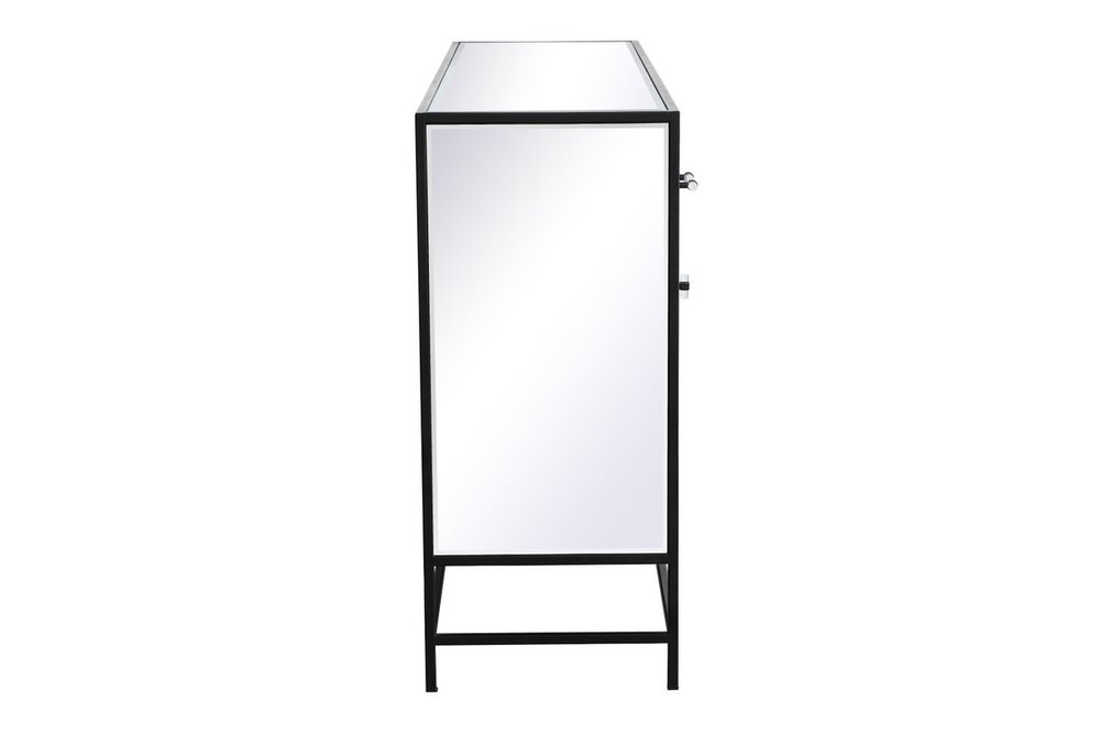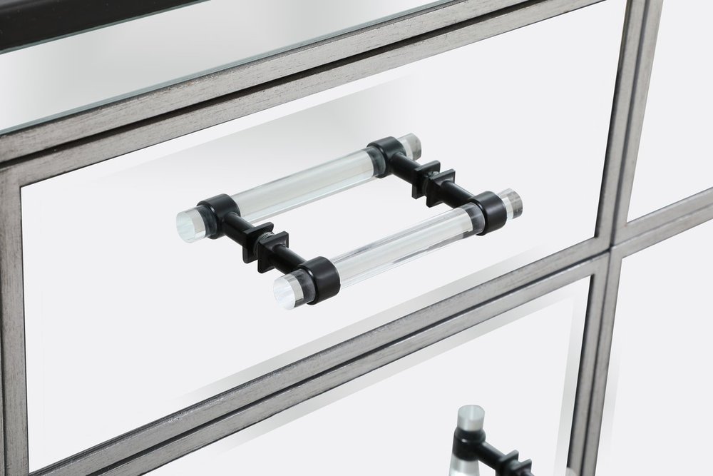 Crafted with mdf, clear mirror panels, and acrylic handles with metal accents