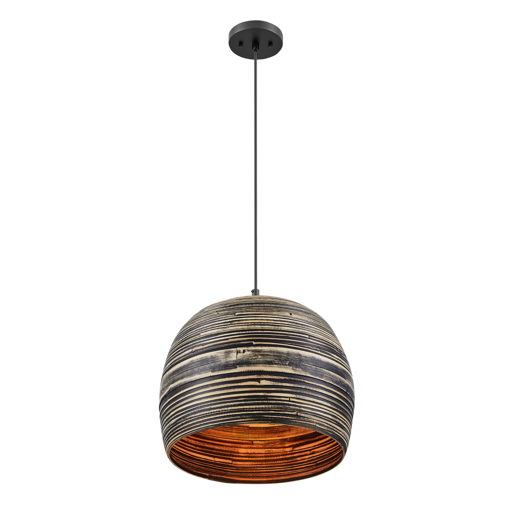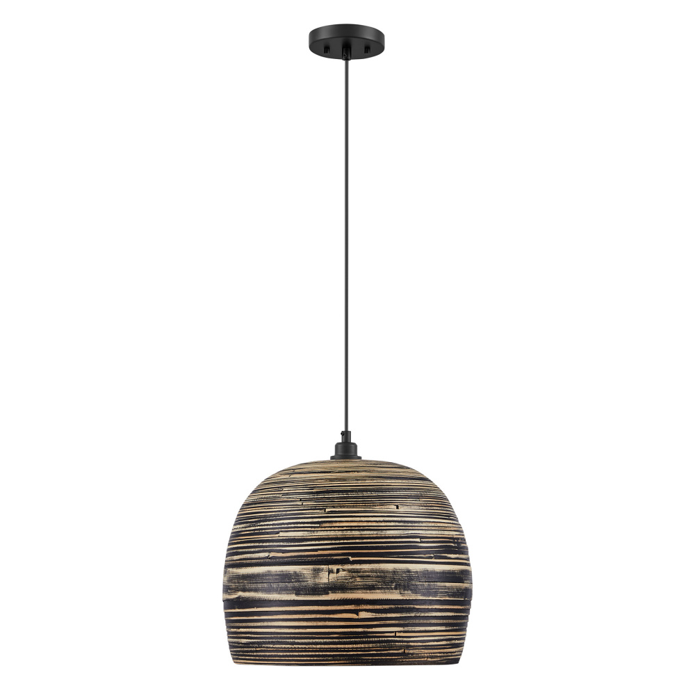 The Savoy House Jamsen 1-light pendant lets you illuminate your home with natural beauty. Its shade is crafted from spun bamboo and is adorned with a lively pattern of black stripes, creating energetic intrigue. Whether used solo or in groupings, Jamsen is sure to stand in the spotlight! It is 15" in height and 15.75" in width. Uses one standard size bulb of up to 60 watts. Bulb not included. This fixture is supplied with 120" of hanging cord.