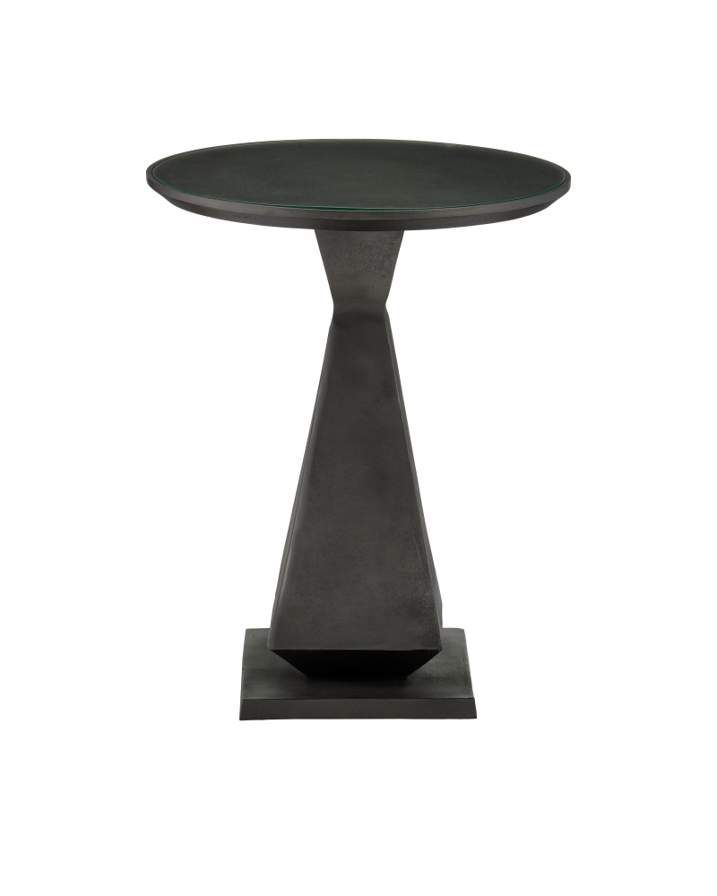 The Janil Accent Table is a generously sized side table forged from cast aluminum with a handsome graphite finish. The geometric shape will make it a striking decorative element in a room while the glass inset into its top will bring confidence that morning coffee or evening wine can be sipped without concerns.