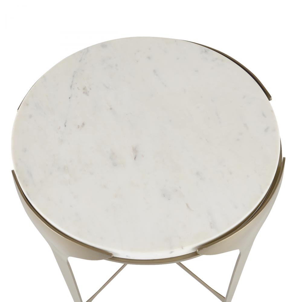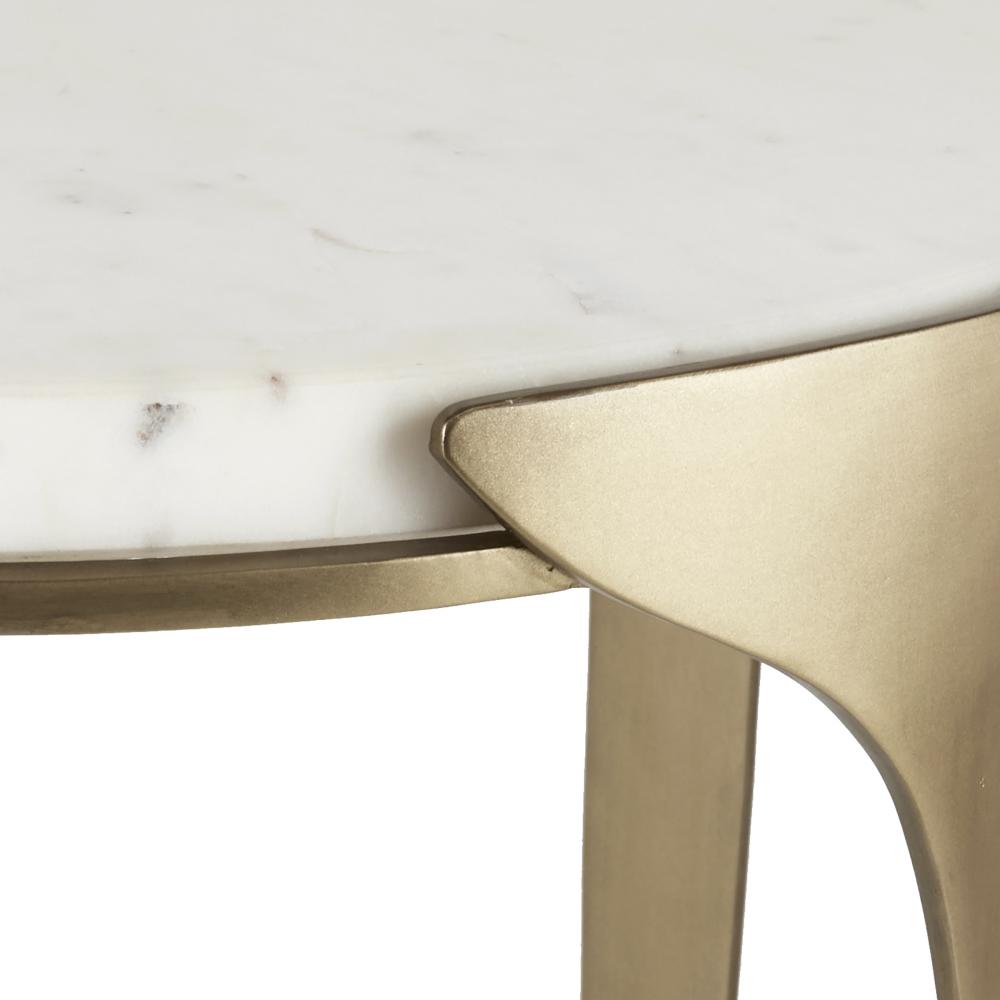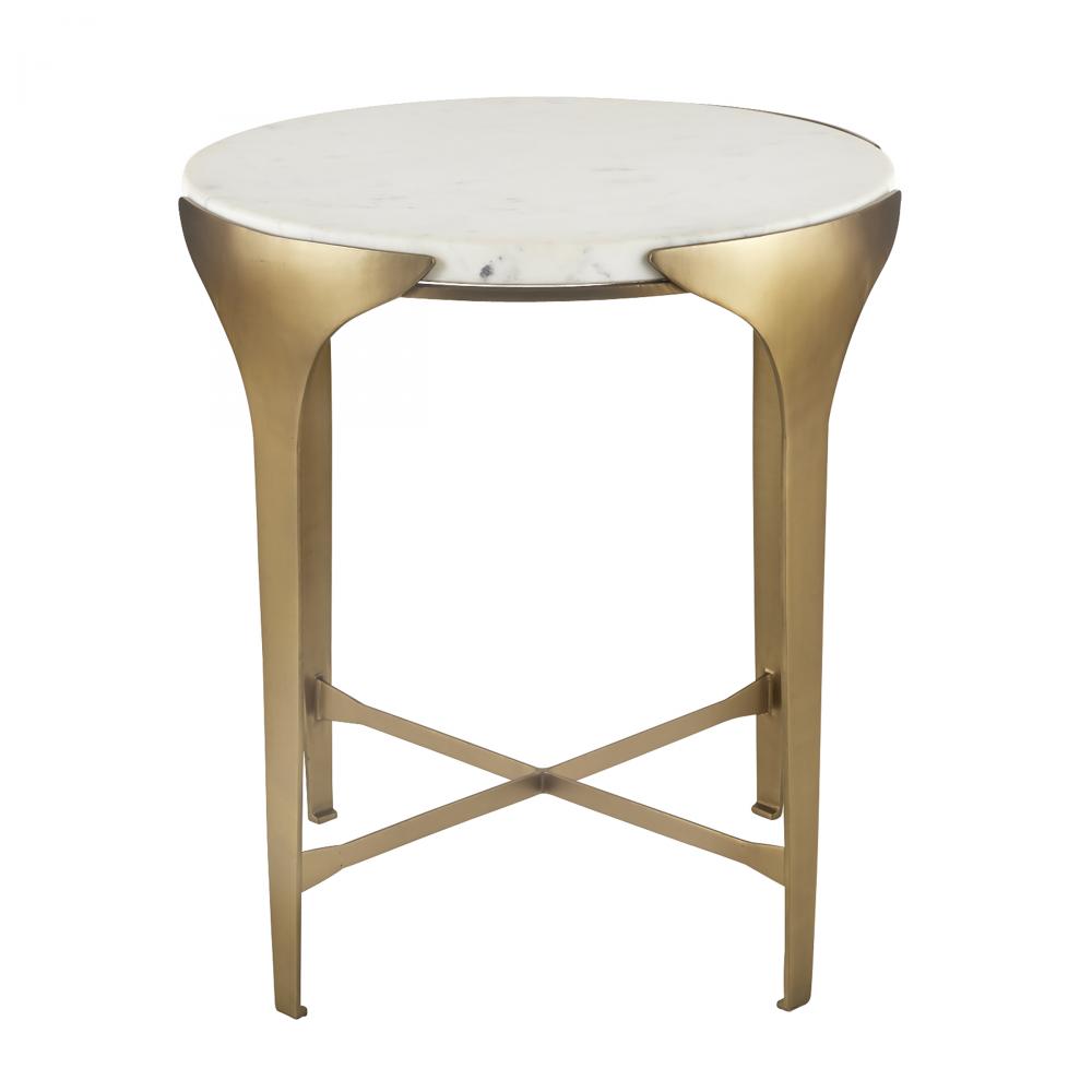 A refined companion for our Janine console, this end table embodies the same subtle design details and minimalist elegance. Drawing inspiration for the Art Deco period, a slender antique brass-plated iron frame gradually flares upward, showcase a white marble top that appears to float within its support. Finish will vary.