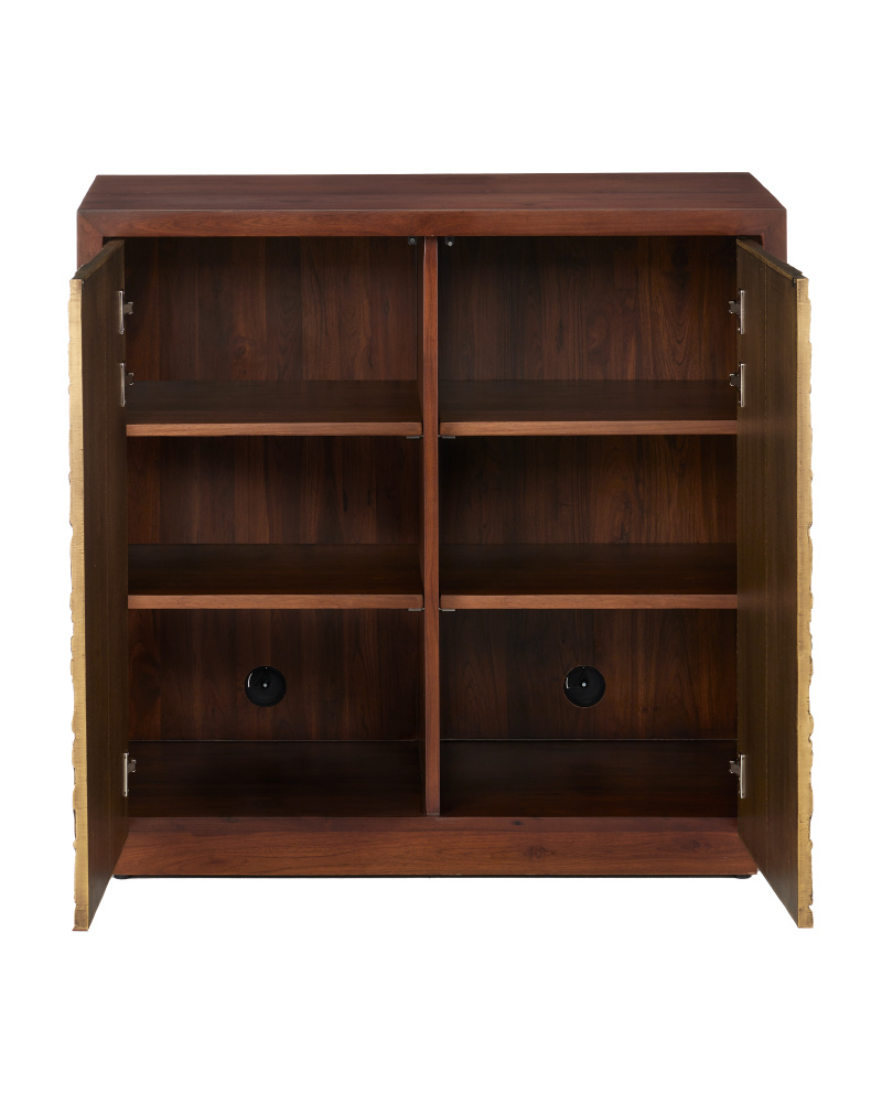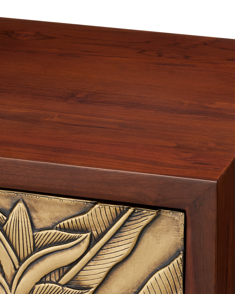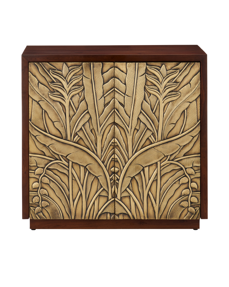 The Jardin Cabinet was created in the tradition of repoussage — a painstaking and laborious process that involves creating low-relief panels with raised motifs onto which thin brass sheets are hammered to reveal the visual richness underneath. in this case, the doors and frame are made of reclaimed teak, finished in walm walnut. The metalwork is rendered in an antique brass finish. This is a tall cabinet, standing 38.5 inches high.