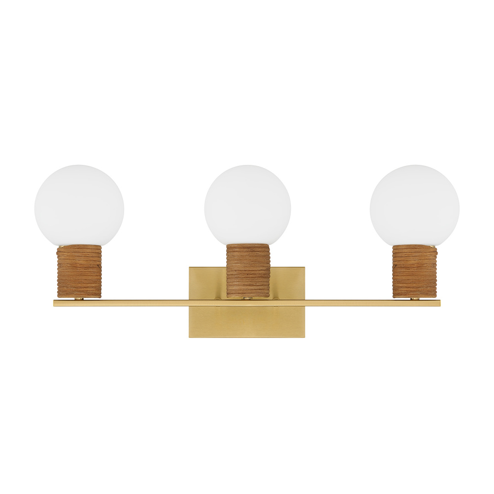Brighten your bath with the inviting warmth of the Jarrell 3-light vanity light. Natural rattan accents, white opal glass and a Warm Brass finish come together for a look that feels relaxed yet refined. Jarrell is 10" tall, 24" wide and extends 6.5" from the wall. It uses three candelabra size bulbs of up to 60 watts each (bulbs not included).