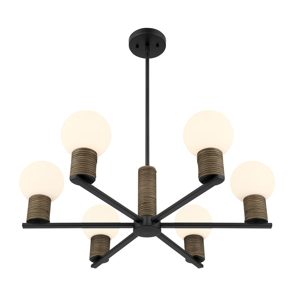 Bring relaxed, modern character into your home with the Savoy House Jarrell 6-light chandelier. Dark rattan accents wrap around orbs of white opal glass, creating soft texture that stands out beautifully against the Matte Black finish. Jarrell is 30" wide and offers an adjustable height ranging from 9.5" to 63". It uses six candelabra size bulbs of up to 60 watts each (bulbs not included) and comes with four 12" downrods and one 6" downrod.