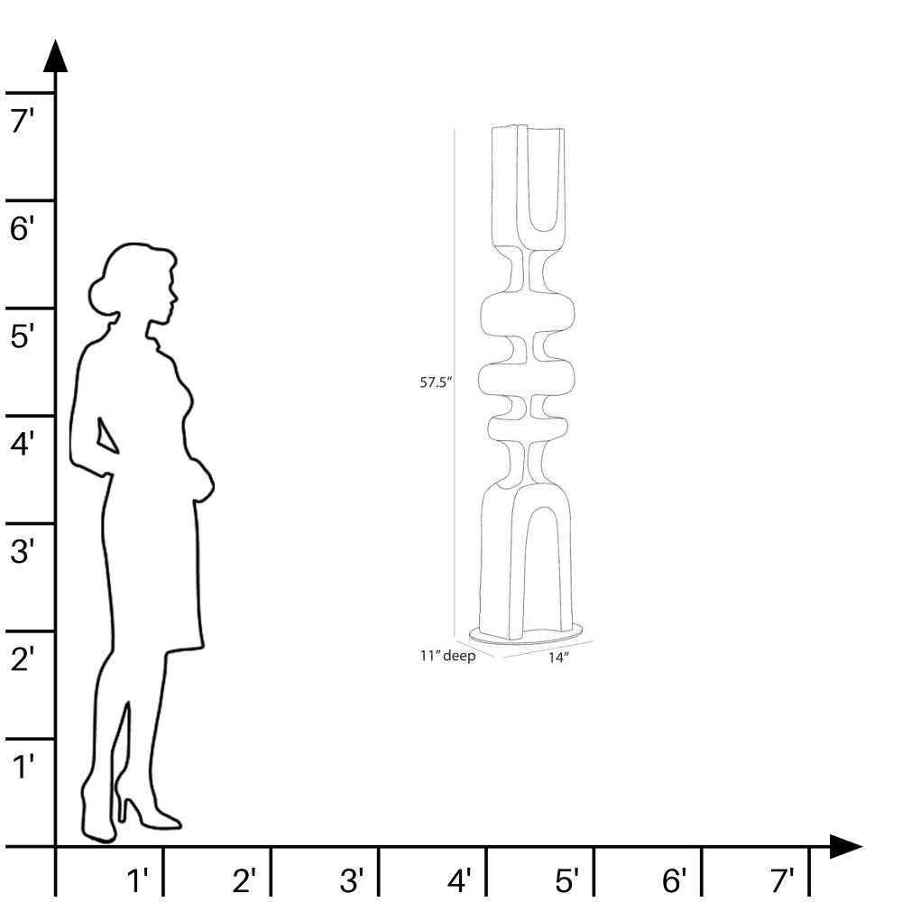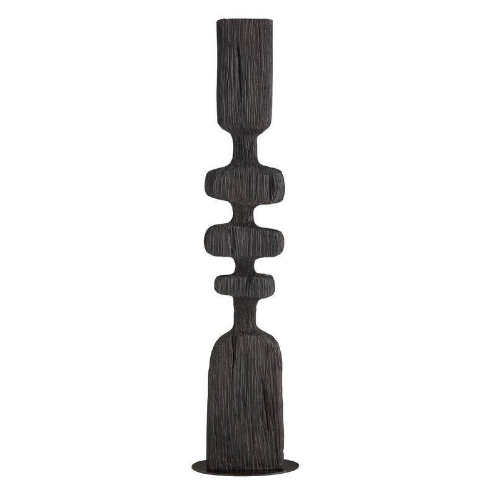 Designed to draw the eye, this monolithic sculpture of ebony resin makes a dynamic accent for any corner. The totemic-inspired shape resembles a fishbone, with a grooved texture that recalls sea-worn driftwood. Mounted on a circular bronze steel base.