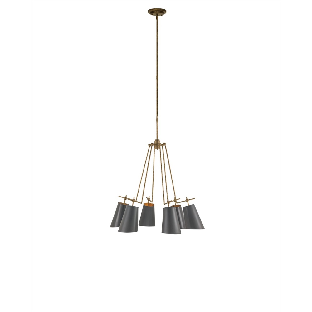 Wrought iron and sheet metal form the kicky Jean-Louis Chandelier, which has shades made to resemble those of a classic task light. These give it the feel of a mid-century modern icon. The exteriors are hand-finished in Marbella black while the interiors exude a warm reflection thanks to our contemporary gold leaf finish. This six-light chandelier is both timeless and functional.