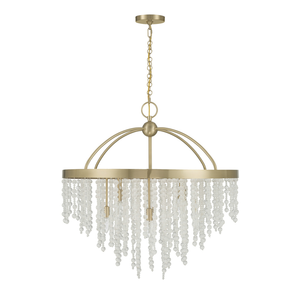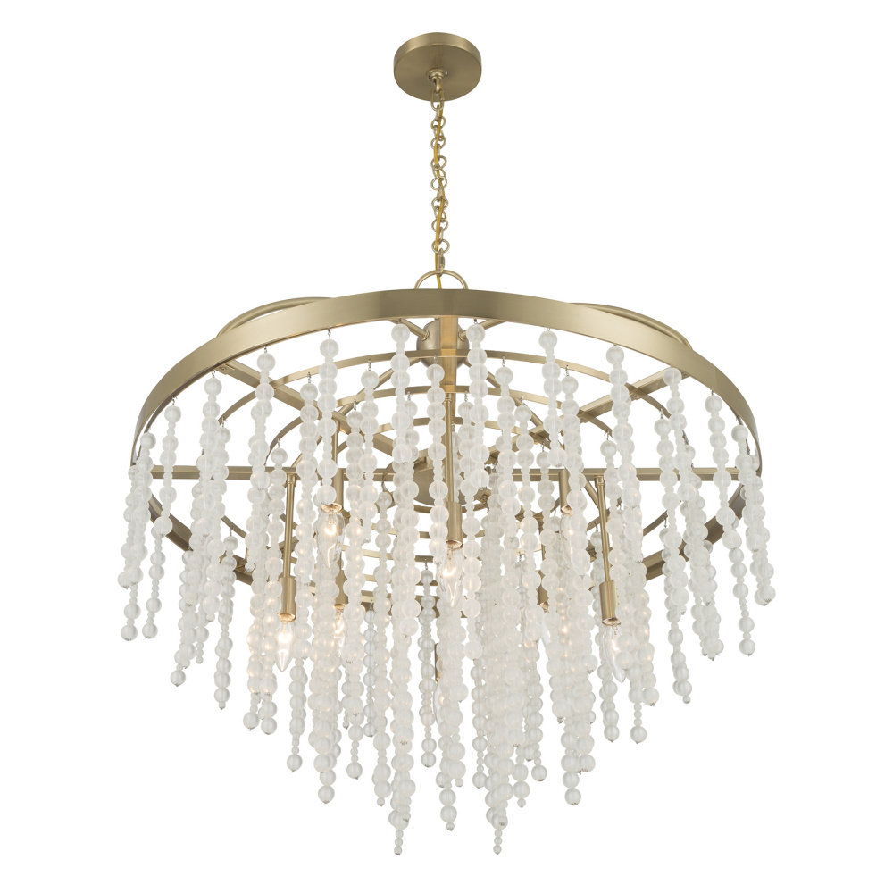 The Savoy House Jeanette 8-light chandelier transforms any room into a softly shimmering focal point. Layers of white frosted glass baubles drift downward in a graceful cascade, giving the fixture a sculptural, buoyant quality. Round chain links echo the circular motif while the Noble Brass finish enriches the look with radiant warmth. Jeanette is 30.88" in height and 30" in width. It uses eight candelabra size bulbs of up to 60 watts per bulb. Bulbs not included. Comes with 120" of chain.