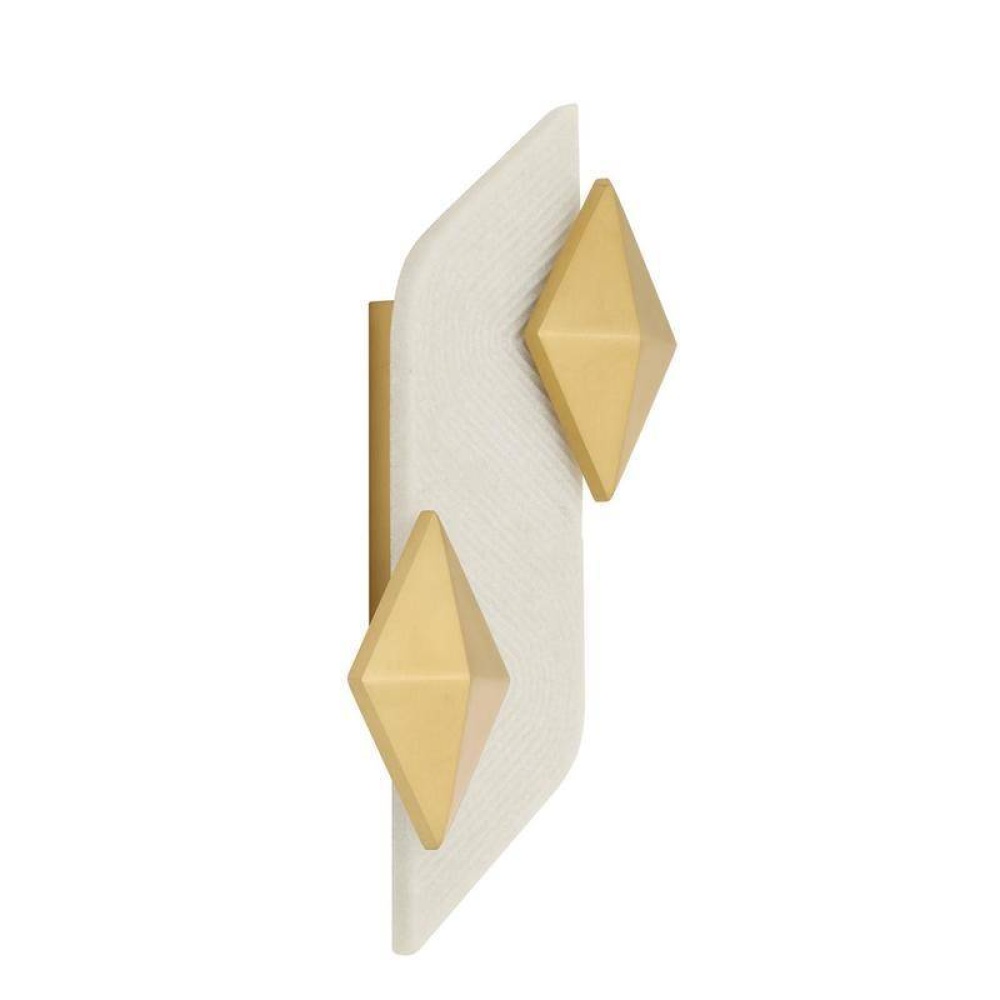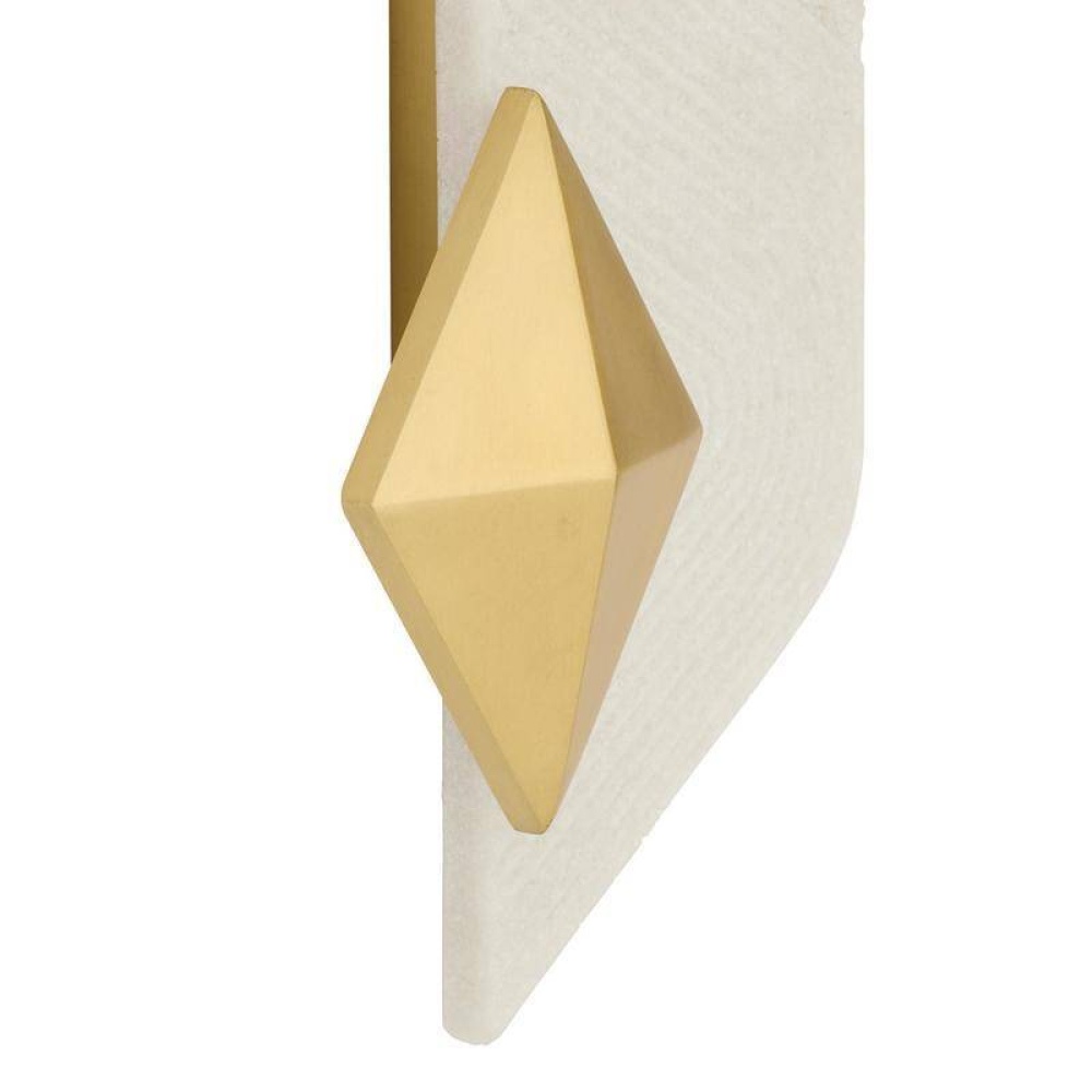 Designed to deliver a wash of light to the wall, double diamonds of antique brass-plated steel clamp at either side of an ivory ricestone composite plate. The graphic line texture adds geometric interest when illuminated. Finish will vary. Damp-rated, although limited, covered outdoor conditions may affect finish.