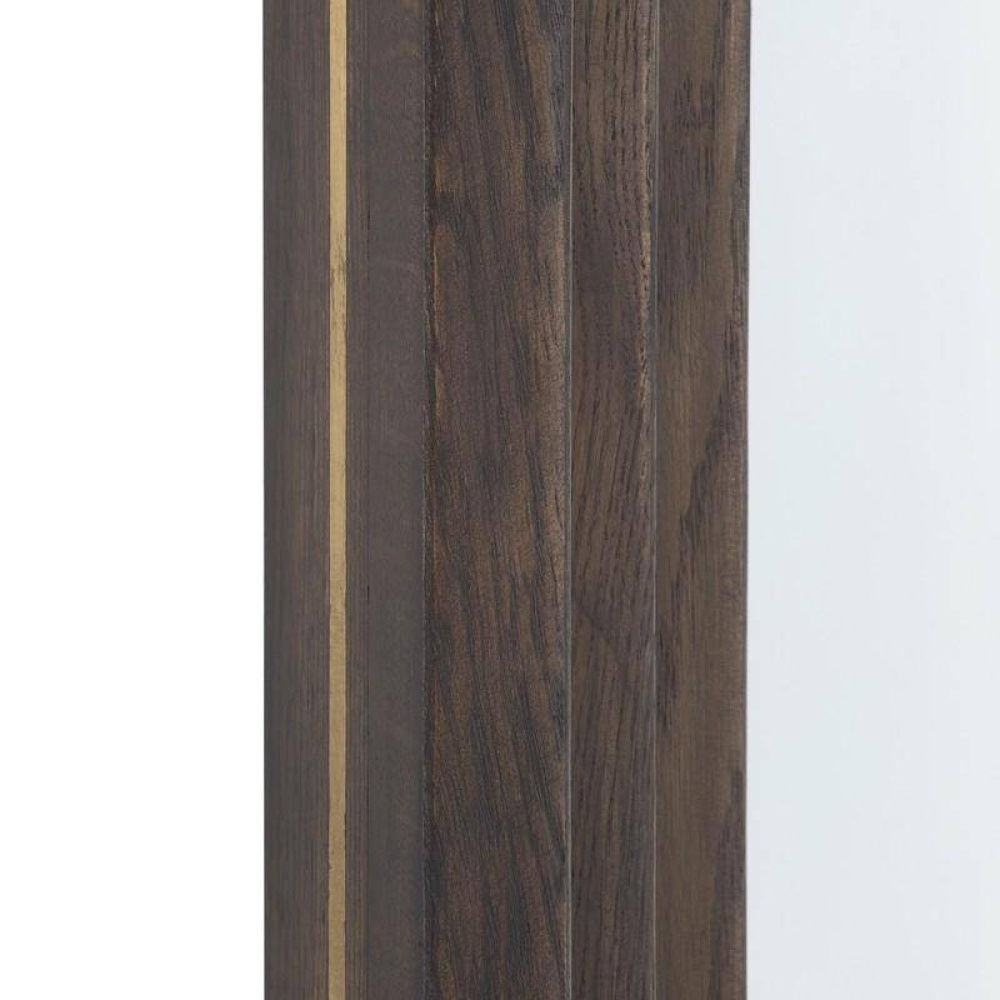 The graceful arches of doorways are reflected in an oversized tiered frame of sable oak wood. Within each carved step and along its side, an inlay of antique brass adds a subtle glimmer when the light hits, creating the illusion of depth. Designed to be hung vertically by a back cleat. Hanging hardware included. Finish will vary.