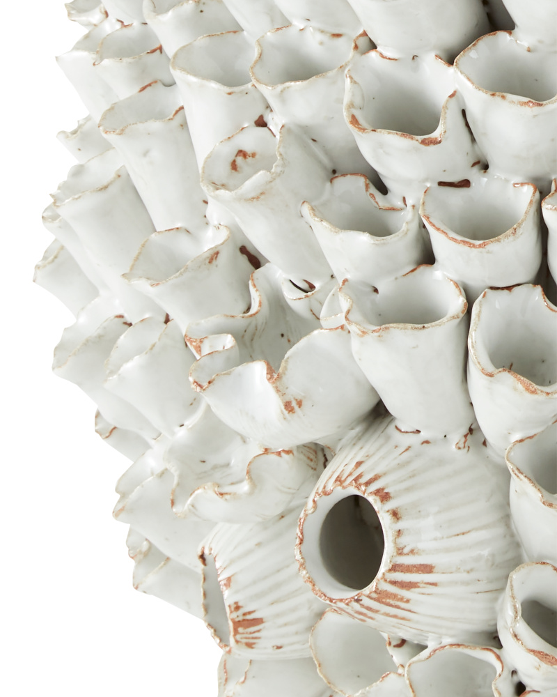 With a surface that is studded with beautifully fashioned white flowers, the Jessamine White Vase is truly an artisanal piece. Rather than apply one type of bloom, a number of floral shapes are intermingled to give the white decorative accessory a charm that is heightened by the top edge that undulates. The handmade character of the piece comes from the fact that each flower is created individually and applied, one-by-one, by hand.