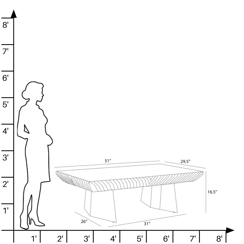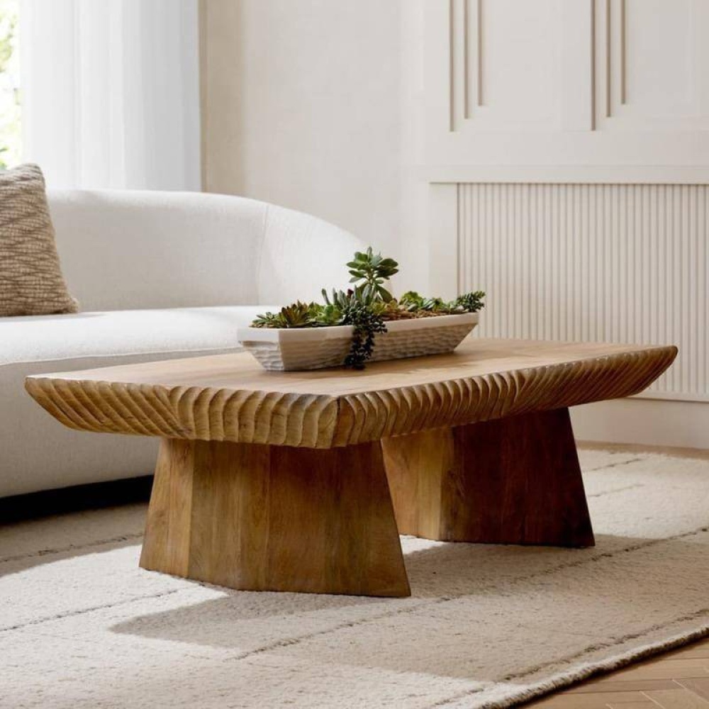 The details of Spanish wood carvings influenced the ridged edges of our substantial handcrafted cocktail table. Crafted of mango wood in a washed tobacco shade, it is accented with sturdy legs in a triangular shape. Finish will vary.