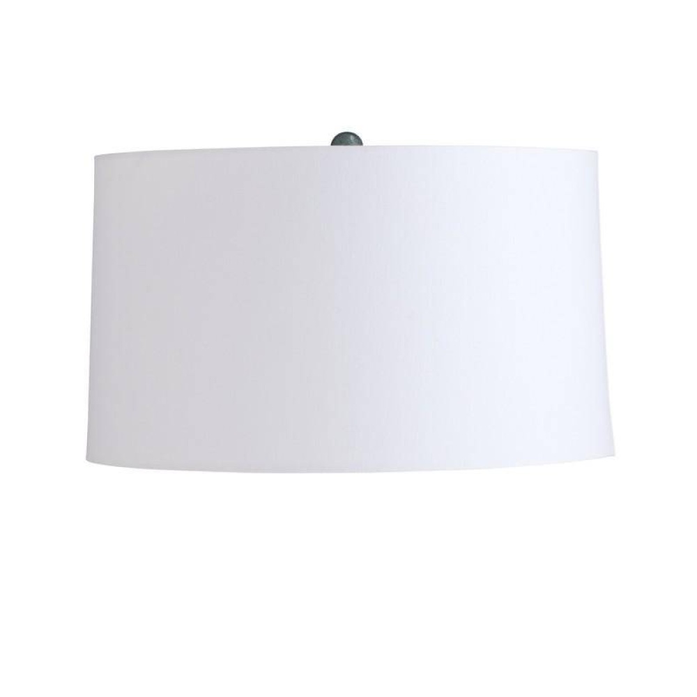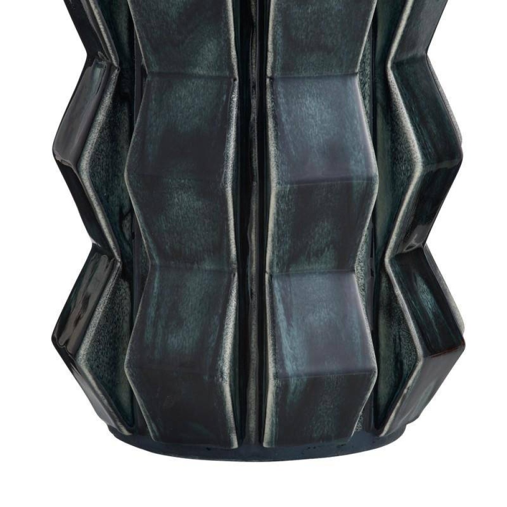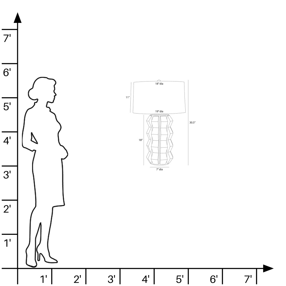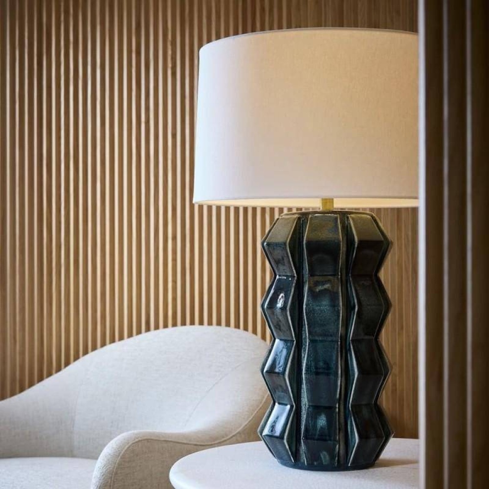 Shaped and glazed to create playful movement, our ceramic Journey is a modern update of a hand-thrown lamp from the mid-century. The zig-zag form is glazed in ocean reactive for subtle gradation and accented with antique brass hardware. Topped with a white linen drum shade and matching ceramic finial. Finish will vary.