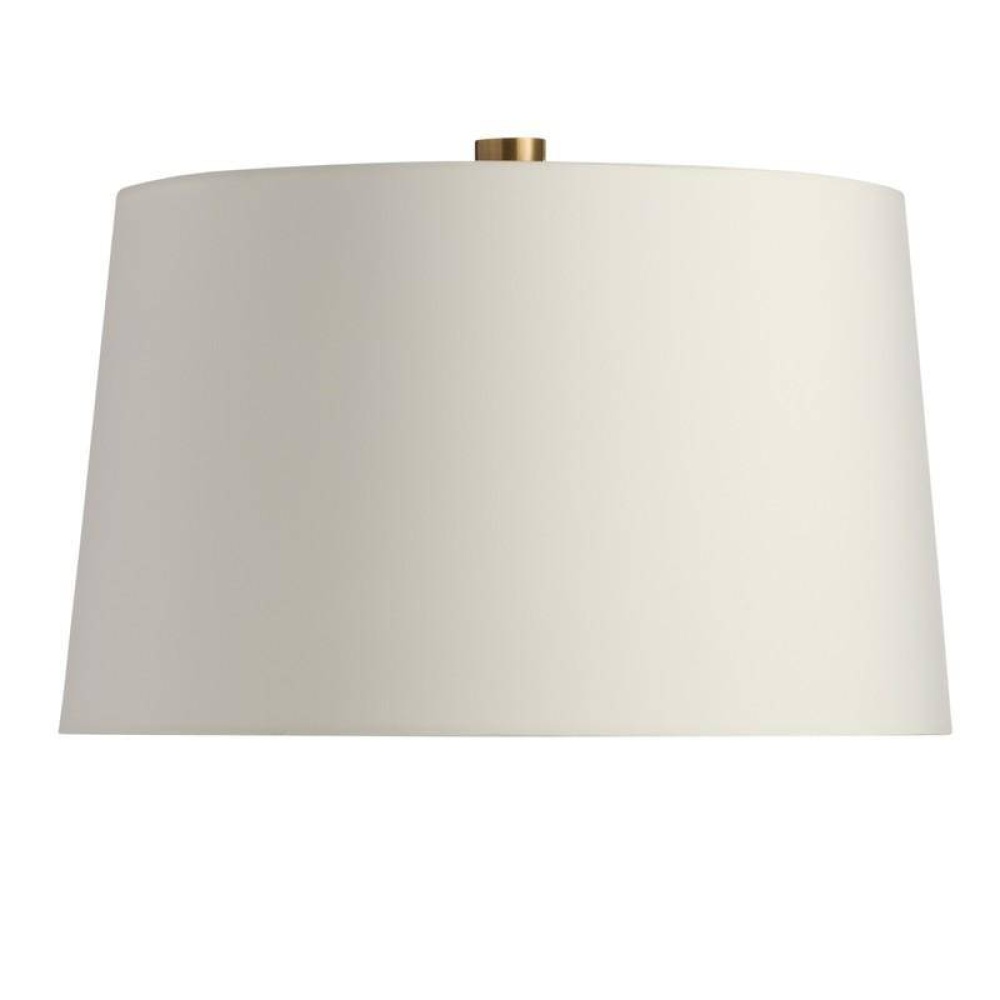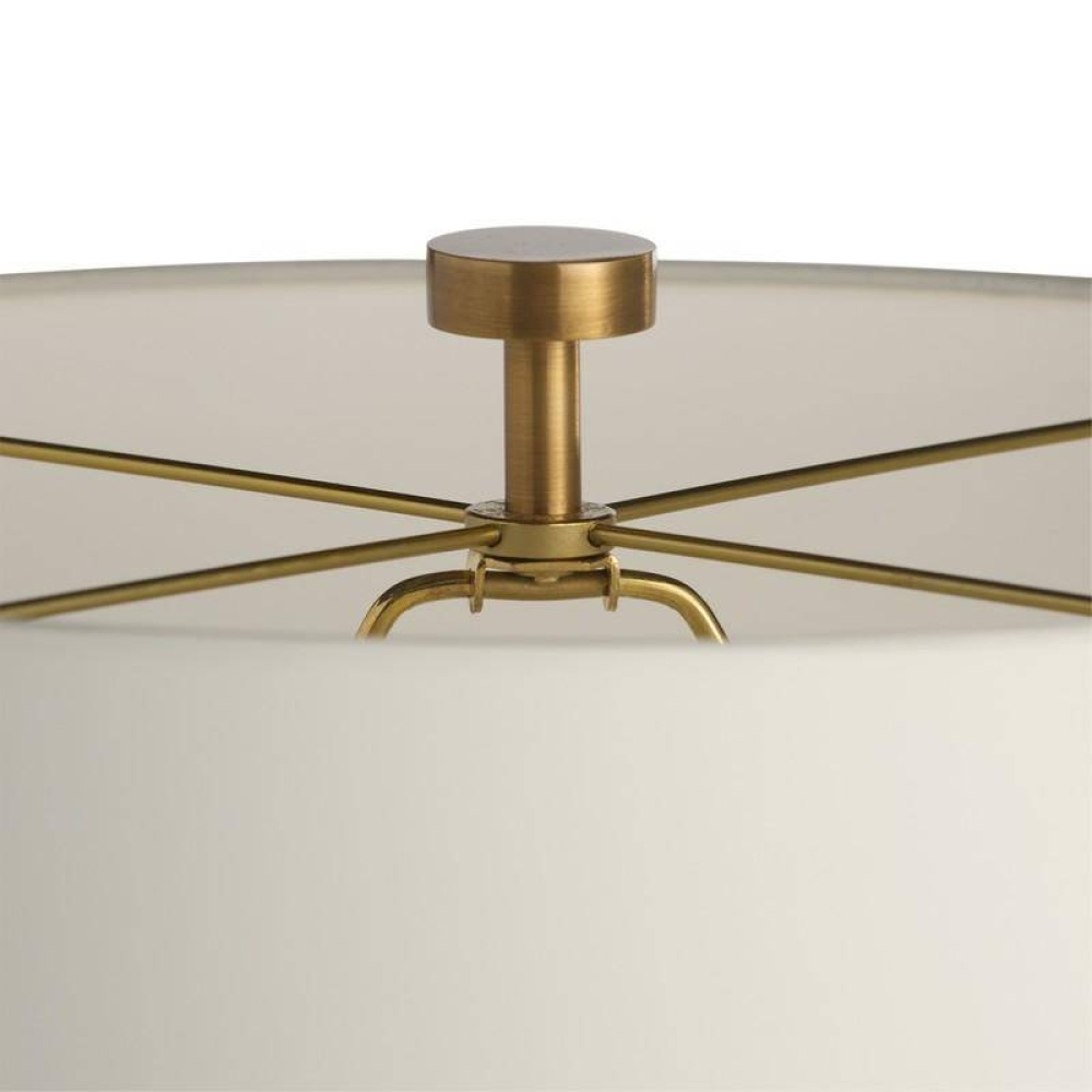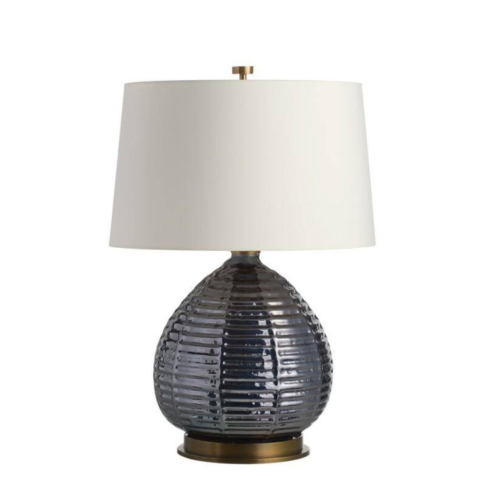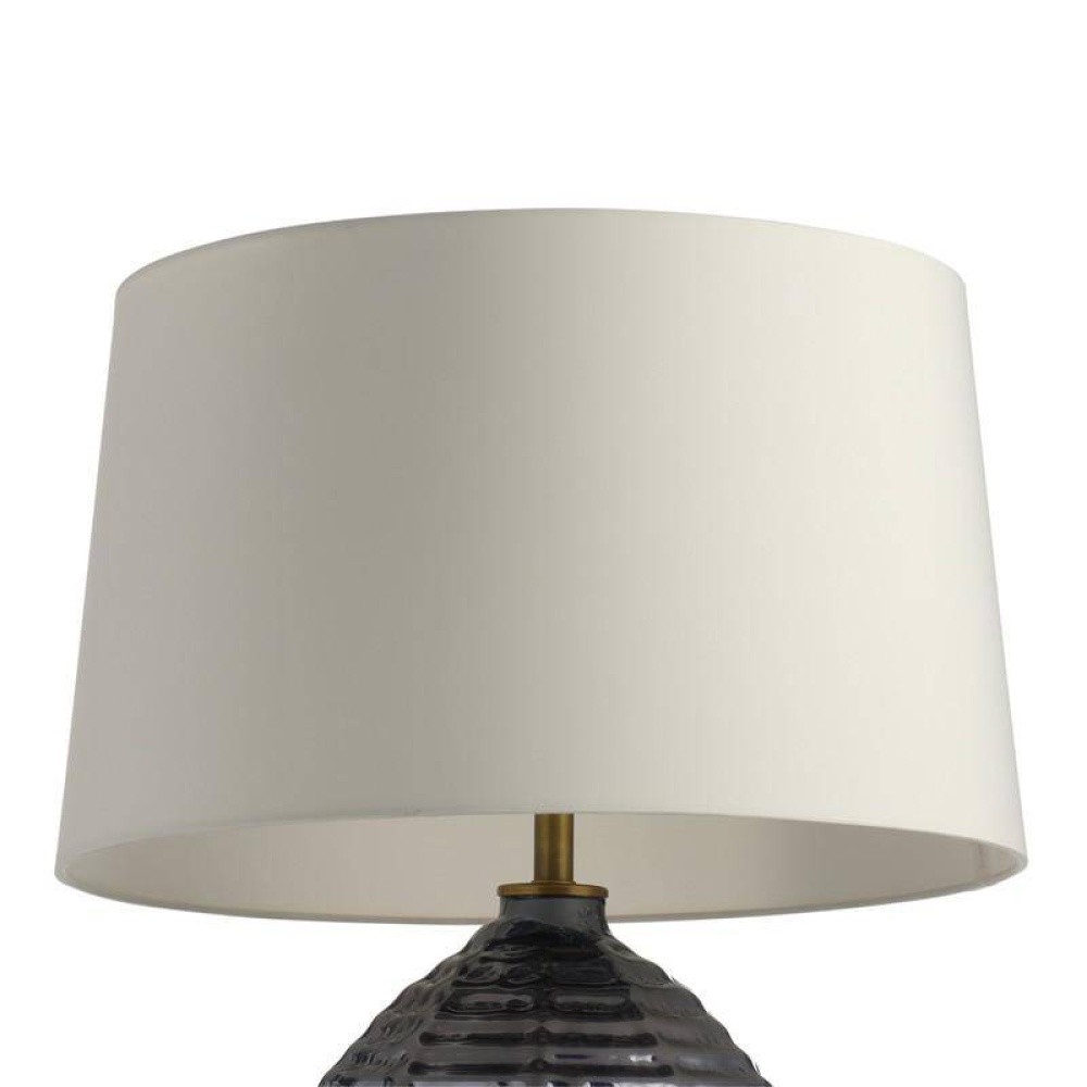 A classic gourd shape of flint luster glass is updated with a ridged texture and glimmering luster finish designed to reflect the light. Accented with antique brass hardware. Matching decorative antique brass finial and ivory microfiber drum shade lined in off-white cotton. Finish will vary.