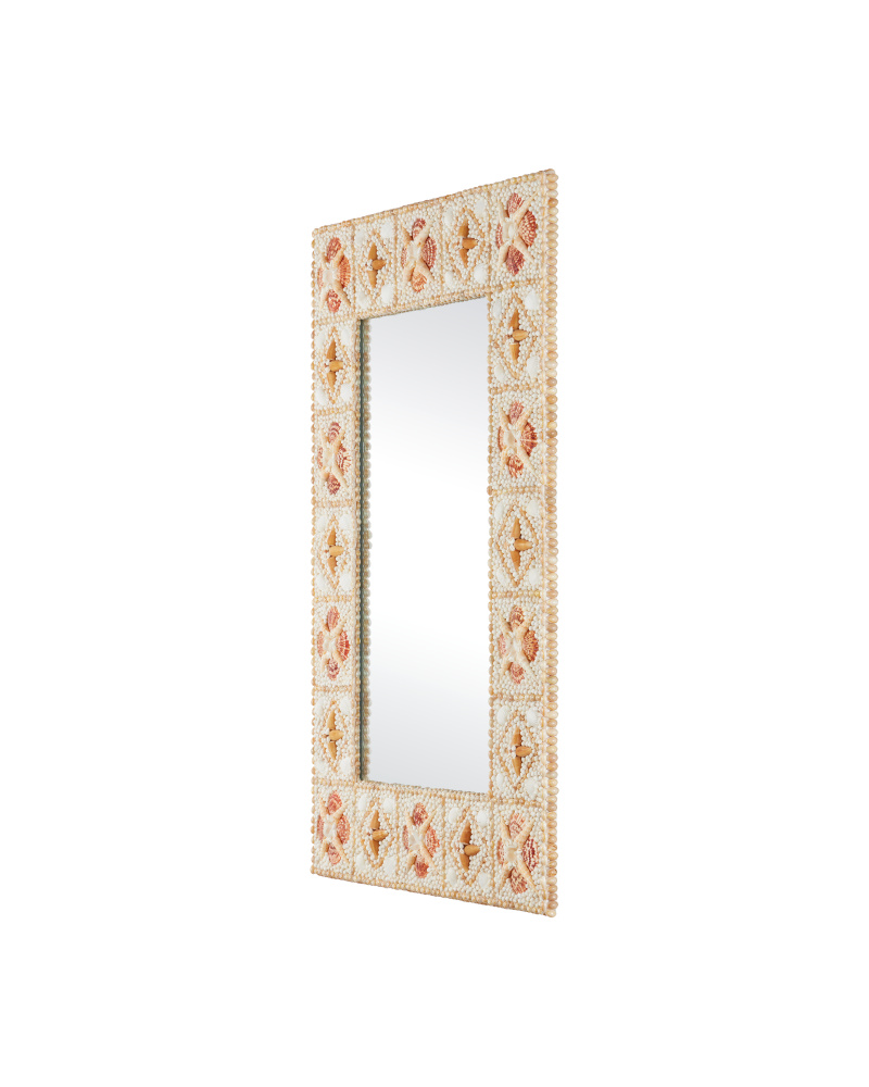 The Junonia Rectangular Mirror has a shell-encrusted frame inspired by a mosaic wall created in coquillage, one of the world’s oldest art forms that utilizes natural shells. The complex pattern, which includes floral motifs in pale peach, white, and purple tones, is affixed to the frame made of wood. Each decorative mirror, which includes cleats for hanging horizontally or vertically and extra shells for spot repairs, will vary slightly given the shells are natural.