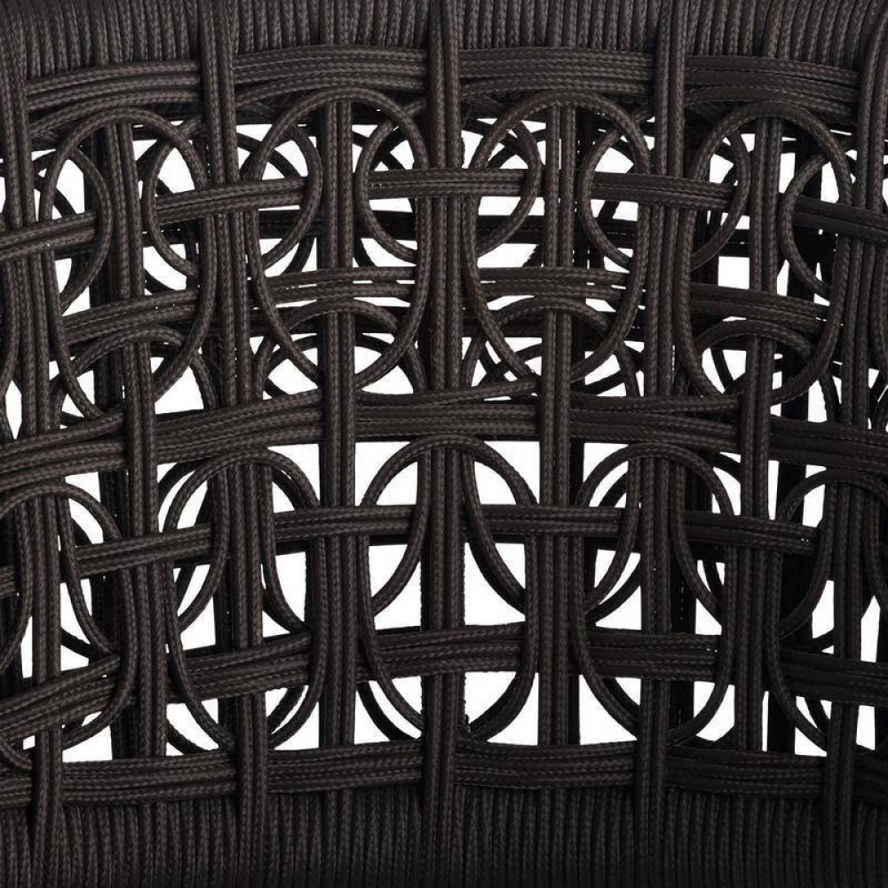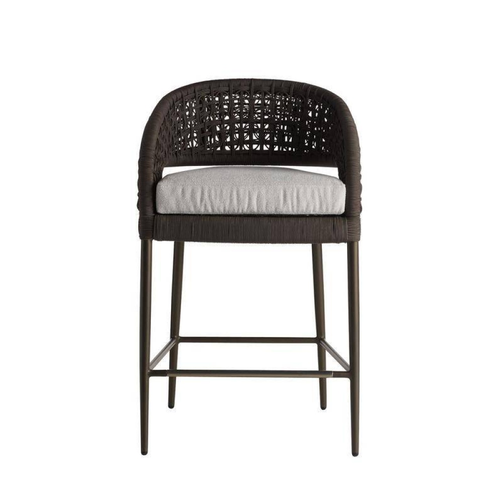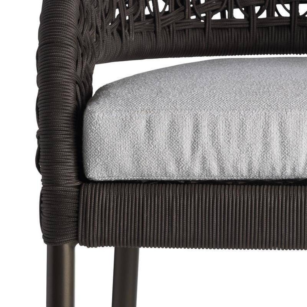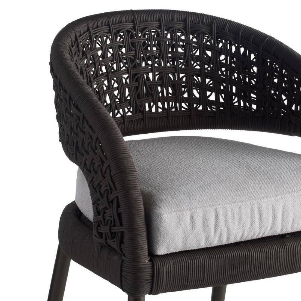 We reinvented the traditional mid-century barrel chair in a charcoal brown synthetic rope to survive the elements. Woven in an organic sculptural style, the wicker-type weave of the Juri’s curved back juxtaposes a sleek frame of dark gray aluminum and a padded cushion of porpoise outdoor performance bouclé. Accented with a stainless-steel footrest caps.