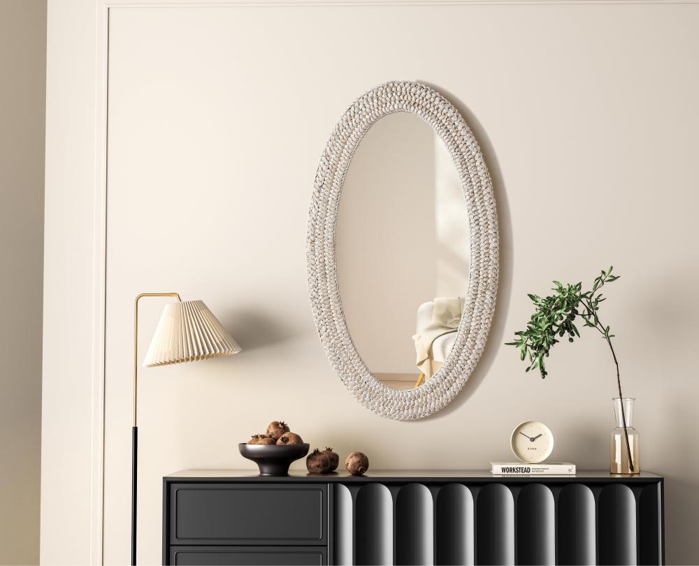Transform your space with this stunning wall mirror that blends natural charm with functional design. Crafted from MDF, cornhusk, and high-quality mirror, the textured woven frame brings warmth and character to your decor. Whether you're decorating a hallway, living room, or bedroom, this mirror comes in a variety of shapes—including rectangle, round, oval, and arch—along with multiple size options to perfectly suit your needs. Designed for versatility, the mirror features three inset metal hangers, allowing you to mount it either vertically or horizontally with ease. Its reflective surface not only adds a touch of brightness but also creates the illusion of a larger room, enhancing your space. with durable materials and ready-to-hang hardware, this mirror is as practical as it is stylish, making it a must-have piece for any home.