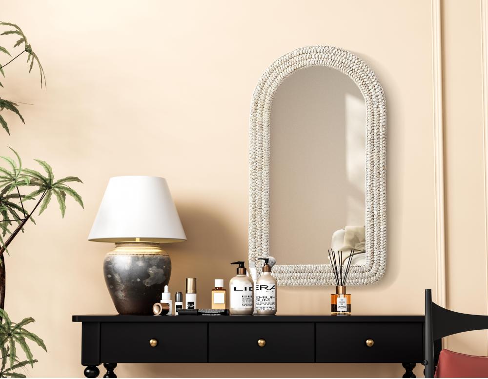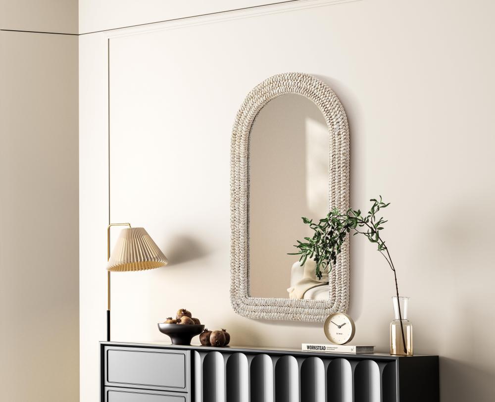 Transform your space with this stunning wall mirror that blends natural charm with functional design. Crafted from MDF, cornhusk, and high-quality mirror, the textured woven frame brings warmth and character to your decor. Whether you're decorating a hallway, living room, or bedroom, this mirror comes in a variety of shapes—including rectangle, round, oval, and arch—along with multiple size options to perfectly suit your needs. Designed for versatility, the mirror features two inset metal hangers, allowing you to mount it vertically with ease. Its reflective surface not only adds a touch of brightness but also creates the illusion of a larger room, enhancing your space. with durable materials and ready-to-hang hardware, this mirror is as practical as it is stylish, making it a must-have piece for any home.