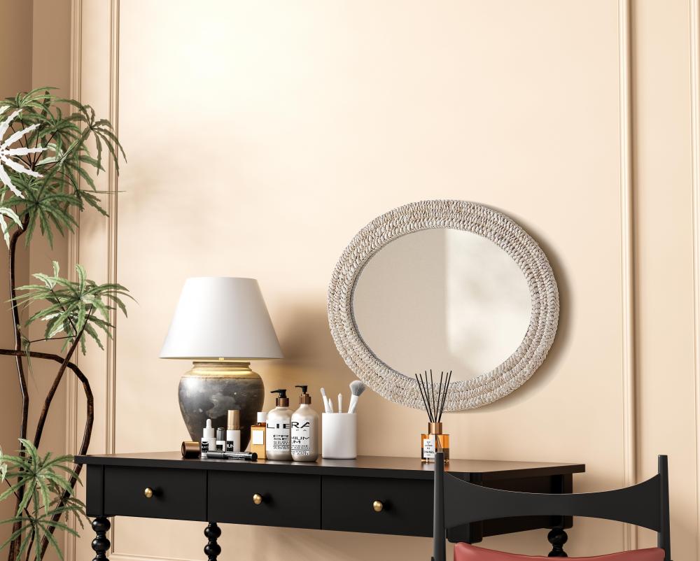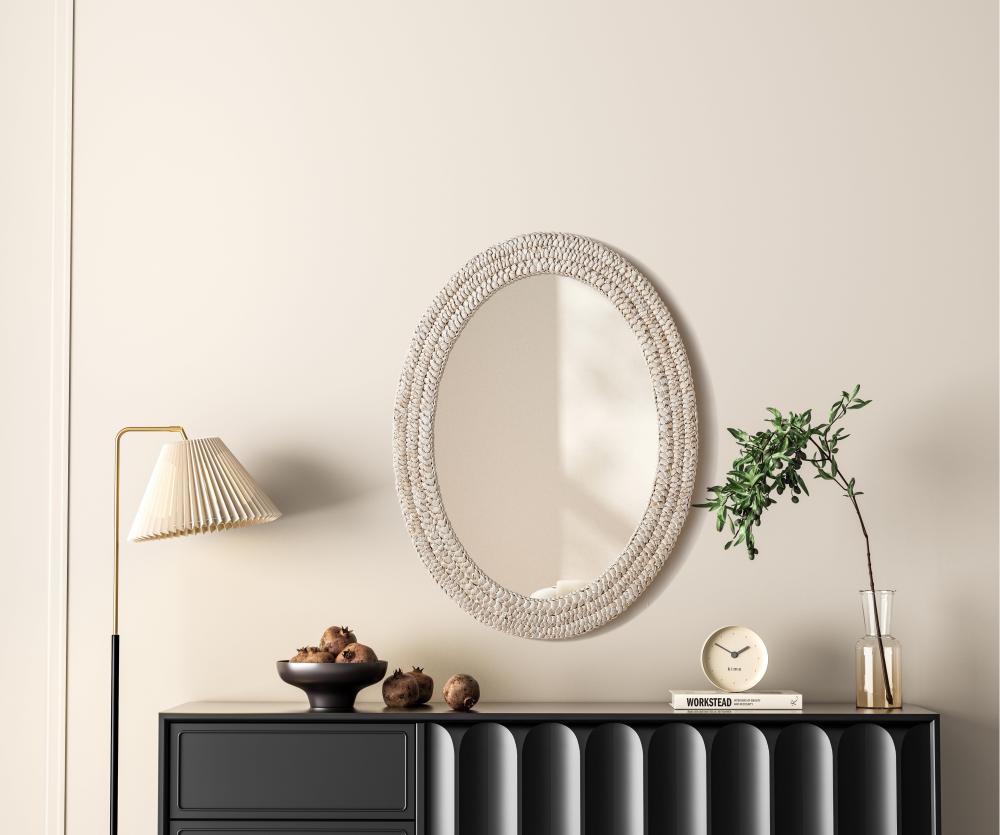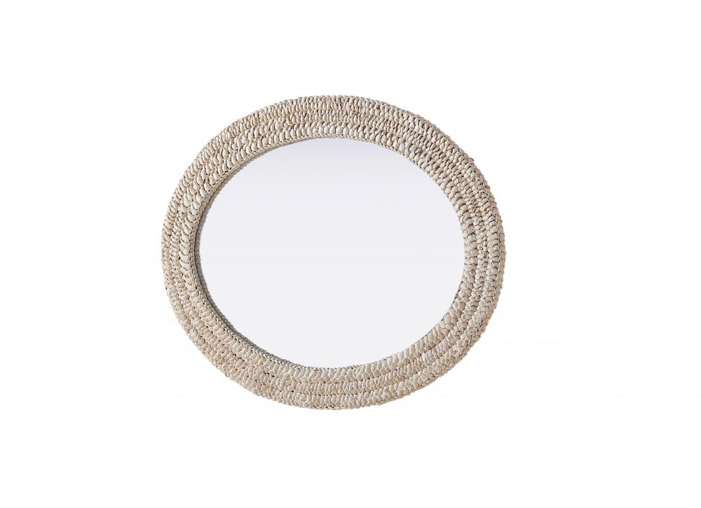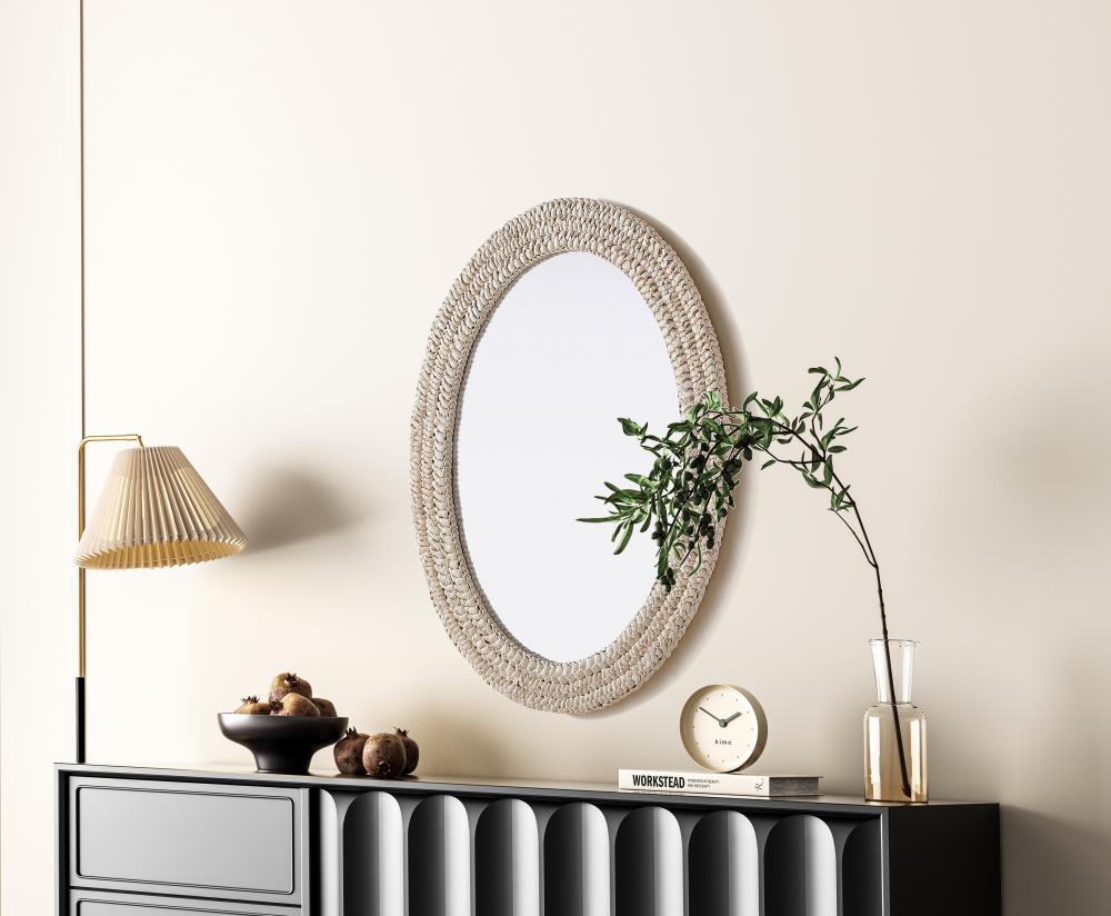 Transform your space with this stunning wall mirror that blends natural charm with functional design. Crafted from MDF, cornhusk, and high-quality mirror, the textured woven frame brings warmth and character to your decor. Whether you're decorating a hallway, living room, or bedroom, this mirror comes in a variety of shapes—including rectangle, round, oval, and arch—along with multiple size options to perfectly suit your needs. Designed for versatility, the mirror features three inset metal hangers, allowing you to mount it either vertically or horizontally with ease. Its reflective surface not only adds a touch of brightness but also creates the illusion of a larger room, enhancing your space. with durable materials and ready-to-hang hardware, this mirror is as practical as it is stylish, making it a must-have piece for any home.