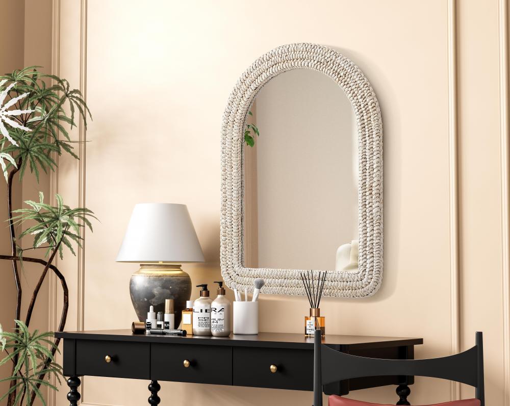 Transform your space with this stunning wall mirror that blends natural charm with functional design. Crafted from MDF, cornhusk, and high-quality mirror, the textured woven frame brings warmth and character to your decor. Whether you're decorating a hallway, living room, or bedroom, this mirror comes in a variety of shapes—including rectangle, round, oval, and arch—along with multiple size options to perfectly suit your needs. Designed for versatility, the mirror features two inset metal hangers, allowing you to mount it vertically with ease. Its reflective surface not only adds a touch of brightness but also creates the illusion of a larger room, enhancing your space. with durable materials and ready-to-hang hardware, this mirror is as practical as it is stylish, making it a must-have piece for any home.