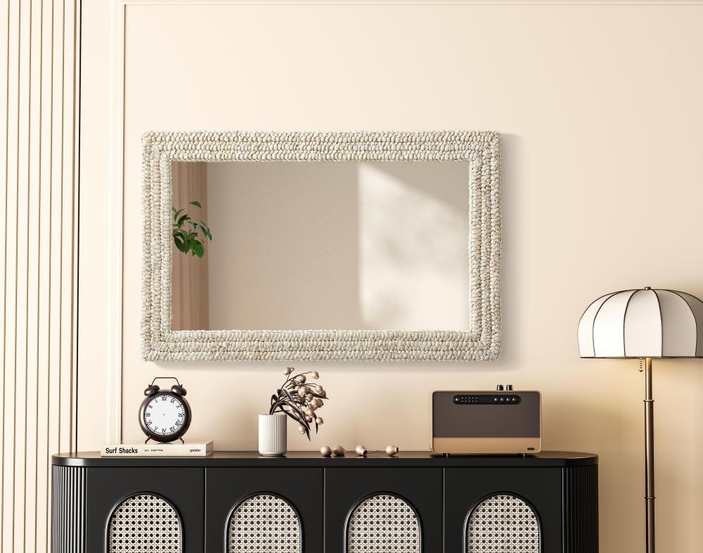 Transform your space with this stunning wall mirror that blends natural charm with functional design. Crafted from MDF, cornhusk, and high-quality mirror, the textured woven frame brings warmth and character to your decor. Whether you're decorating a hallway, living room, or bedroom, this mirror comes in a variety of shapes—including rectangle, round, oval, and arch—along with multiple size options to perfectly suit your needs. Designed for versatility, the mirror features four inset metal hangers, allowing you to mount it either vertically or horizontally with ease. Its reflective surface not only adds a touch of brightness but also creates the illusion of a larger room, enhancing your space. with durable materials and ready-to-hang hardware, this mirror is as practical as it is stylish, making it a must-have piece for any home.