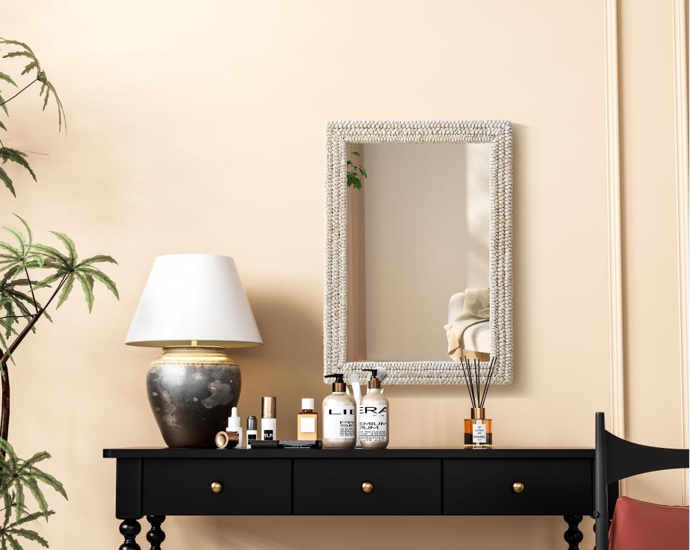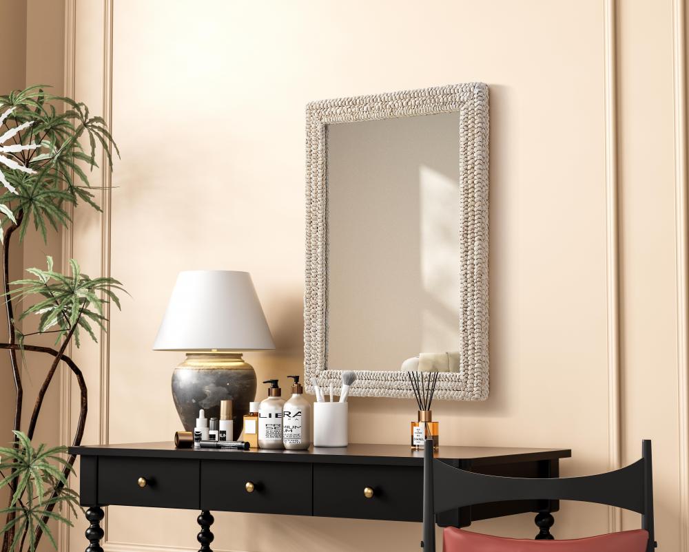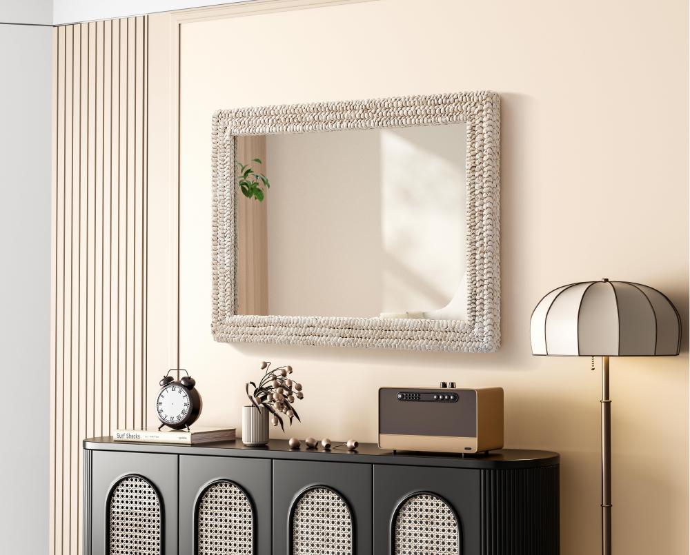 Transform your space with this stunning wall mirror that blends natural charm with functional design. Crafted from MDF, cornhusk, and high-quality mirror, the textured woven frame brings warmth and character to your decor. Whether you're decorating a hallway, living room, or bedroom, this mirror comes in a variety of shapes—including rectangle, round, oval, and arch—along with multiple size options to perfectly suit your needs. Designed for versatility, the mirror features four inset metal hangers, allowing you to mount it either vertically or horizontally with ease. Its reflective surface not only adds a touch of brightness but also creates the illusion of a larger room, enhancing your space. with durable materials and ready-to-hang hardware, this mirror is as practical as it is stylish, making it a must-have piece for any home.