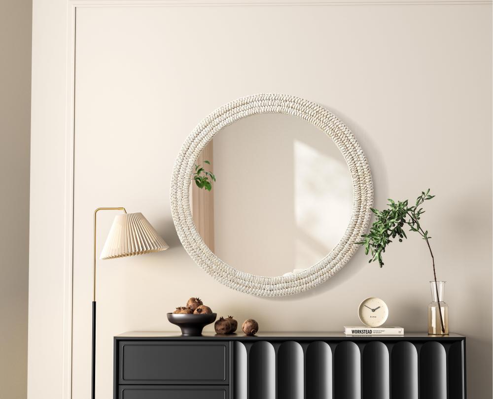 Transform your space with this stunning wall mirror that blends natural charm with functional design. Crafted from MDF, cornhusk, and high-quality mirror, the textured woven frame brings warmth and character to your decor. Whether you're decorating a hallway, living room, or bedroom, this mirror comes in a variety of shapes—including rectangle, round, oval, and arch—along with multiple size options to perfectly suit your needs. Designed for versatility, the mirror features two inset metal hangers, allowing you to mount it vertically with ease. Its reflective surface not only adds a touch of brightness but also creates the illusion of a larger room, enhancing your space. with durable materials and ready-to-hang hardware, this mirror is as practical as it is stylish, making it a must-have piece for any home.